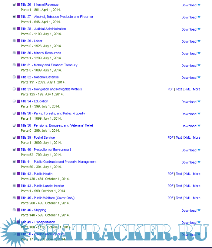 Year: 2014 Language: english Author: National Archives and Records Administration's Office of the Federal Register (OFR) and the Government Printing Office Publisher: Federal Register by the departments and agencies of the Federal Government Edition: 2014 Format: PDF Quality: eBook Description: The Code of Federal Regulations (CFR) annual edition is the codification of the general and permanent rules published in the Federal Register by the departments and agencies of the Federal Government. It is divided into 50 titles that represent broad areas subject to Federal regulation. The 50 subject matter titles contain one or more individual volumes, which are updated once each calendar year, on a staggered basis. The annual update cycle is as follows: titles 1-16 are revised as of January 1; titles 17-27 are revised as of April 1; titles 28-41 are revised as of July 1; and titles 42-50 are revised as of October 1. Each title is divided into chapters, which usually bear the name of the issuing agency. Each chapter is further subdivided into parts that cover specific regulatory areas. Large parts may be subdivided into subparts. All parts are organized in sections, and most citations to the CFR refer to material at the section level. Content: - Title 33 - Navigation and Navigable Waters - Title 46 - Shipping - Title 47 - Telecommunication - Title 49 - Transportation