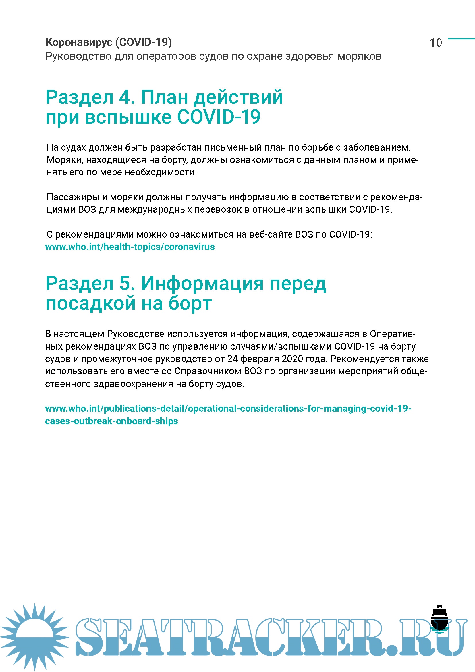 Описание: В ответ на нынешнюю вспышку коронавируса (COVID-19), Международная палата судоходства (МПС) подготовила данное Руководство для оказания поддержки судам всех типов, работающим в международных водах. Цель заключается в том, чтобы помочь судоходным компаниям следовать рекомендациям, предоставляемым учреждениями Организации Объединенных Наций, включая Всемирную организацию здравоохранения (ВОЗ), Международную морскую организацию (ММО) и Международную организацию труда (МОТ), а также Европейский центр по профилактике заболеваний и борьбе с ними (ЕЦПЗ).
