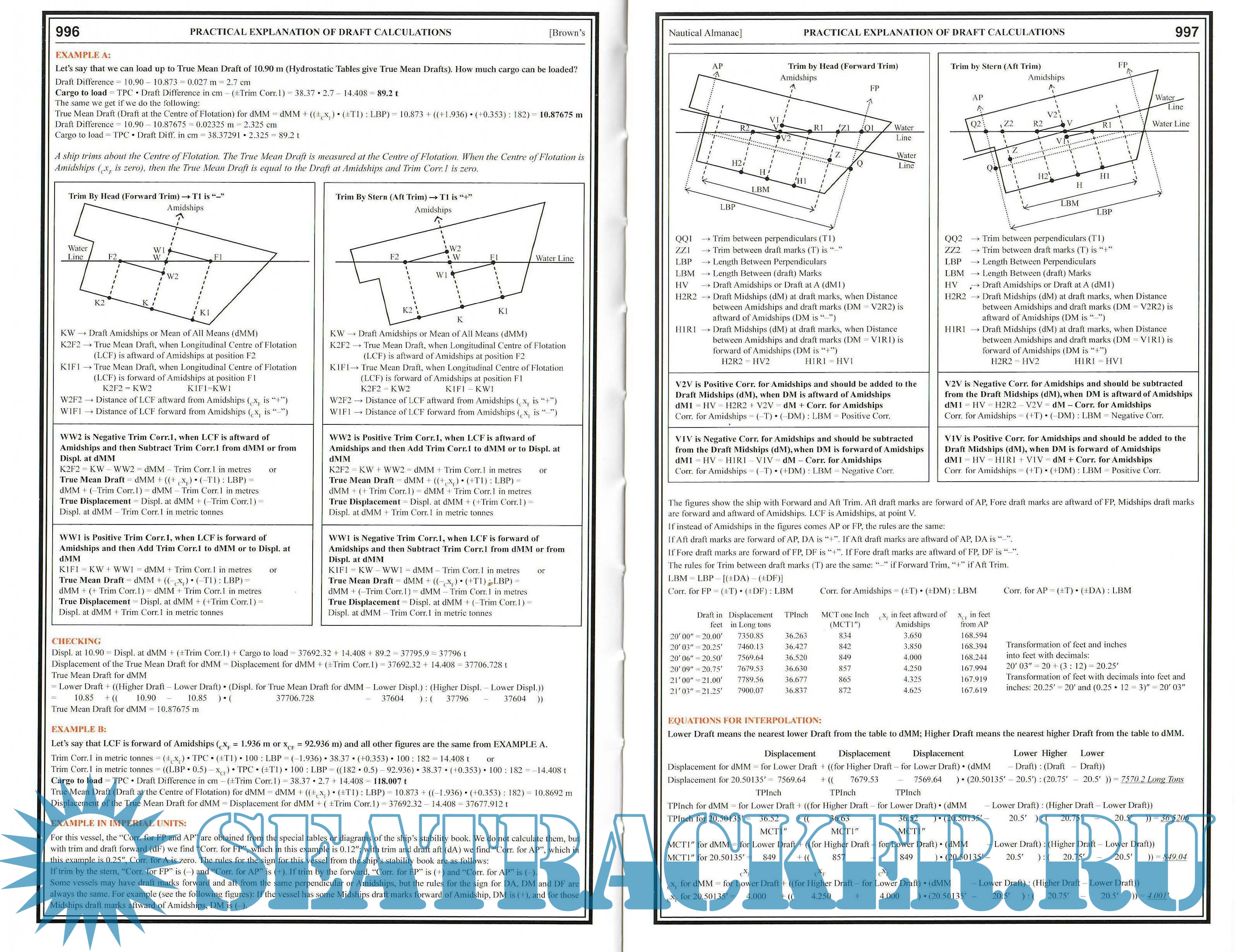 Metacentric Height and List Calculations, with List Draft Changes, etc. Draft Surveying and Displacement Calculations (5 pages), How to get Trim and Drafts Forward and Aft by Distance between Longitudinal Centres of Buoyancy and Gravity, Tank's Vertical Centre of Gravity, Free Surface in the Tank, Useful Information for Safety of Navigation and a Ship, Sailings, Great Circle Sailing, Differences in Nautical Miles between Great Circle Distance (Sphere) and Theoretical Geodesic Curve Distance (Spheroid, WGS-84), etc.