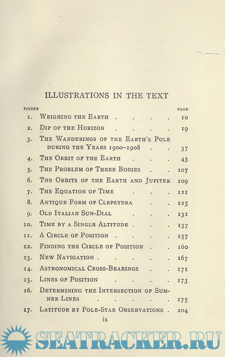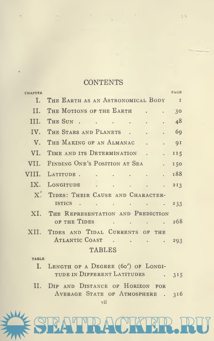 The theory of the Sumner lines of position is simple and widely applicable to all navigational problems, and forms the basis upon which the whole theory of practical navigation depends. Therefore the Sumner method of finding one's position at sea, combined with modern methods of reduction, is covered extensively. Astronomy and nautical use of celestial bodies, time and its determination, nautical almanac are explained as well. At the end of each chapter is to be found a sort of appendix containing notes, formulas, and practical examples. This portion of the book forms a condensed treatise on modern methods of navigation. A considerable part of the book is devoted to an explanation of the tides and tidal currents, their peculiarities and their causes.
