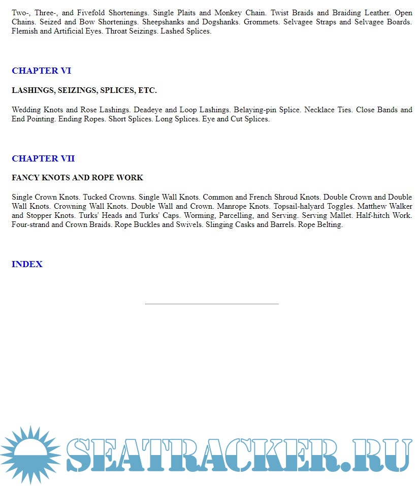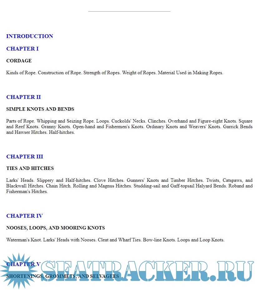 Year: 1917 Language: english Author: A. Hyatt Verrill Genre: Manual Format: EPUB Quality: OCR without errors Pages count: n/a (epub) 127 (pdf) Description: A practical treatise giving complete and simple directions for making all the most useful and ornamental knots in common use, with chapters on splicing, pointing, seizing, serving, lashings, shortening and grommets. Illustrated with 156 original cuts showing how each knot, tie or splice is formed, and its appearance when complete. Additional info: Note. Original file is epub. Pdf is added for reader's convenience, and it's been automatically generated.