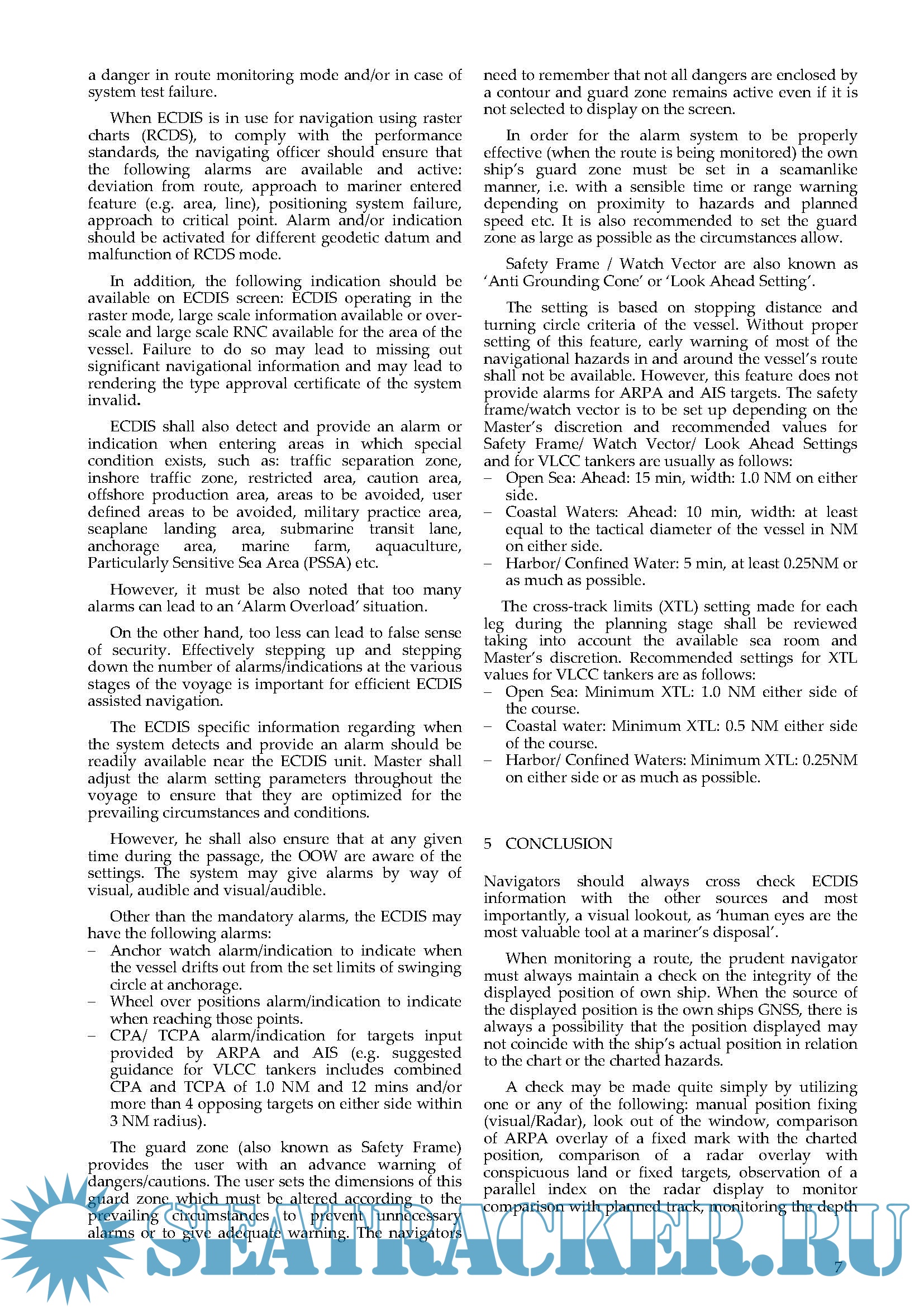 must be understood and entered to achieve a sensible and considered meaning and alarm settings. The navigators must remember that the display of underwater obstructions or isolated danger symbols can change according to the settings of this safety contour which also marks the division between navigable (safe) and non navigable (unsafe) water. Improper management of the system may result in the antigrounding alarms and other indications failing to activate as required for the safe conduct of the navigation. Consequently, it could give a false impression of safe waters around the vessel where some dangers may not be shown due to the limitations imposed by original chart scale. This paper recognizes the limitations of ECDIS display, the significance of appropriate safety settings as well as the alarm management recommended for passage planning & route monitoring on VLCC tankers.