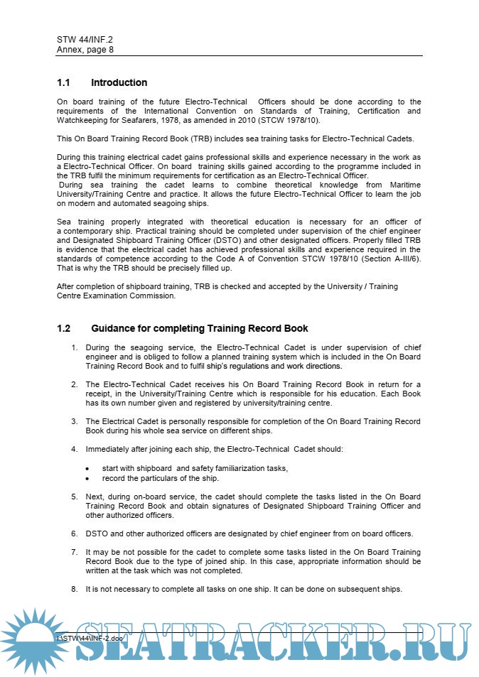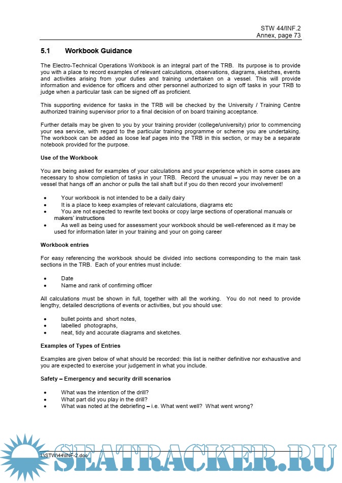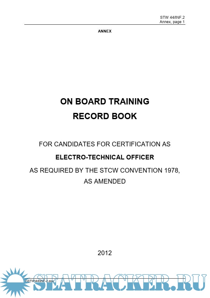 Description: This On Board Training Record Book (TRB) for candidates for certification as Electro-Technical Officer is based on material developed by the Faculty of Marine ElectricalEngineering, Gdynia Maritime University, Poland and other TRBs developed in United Kingdom, Ukraine and France.