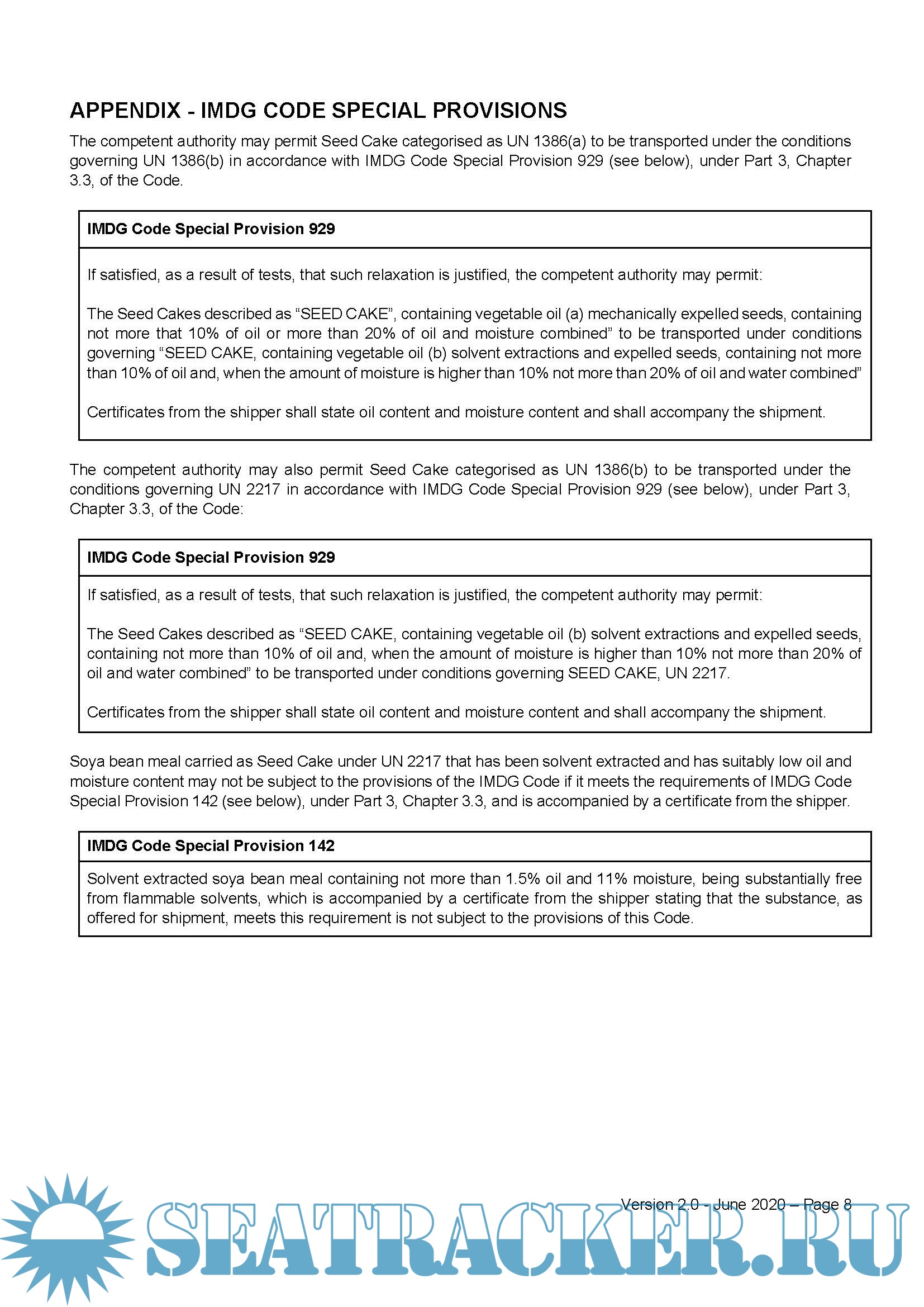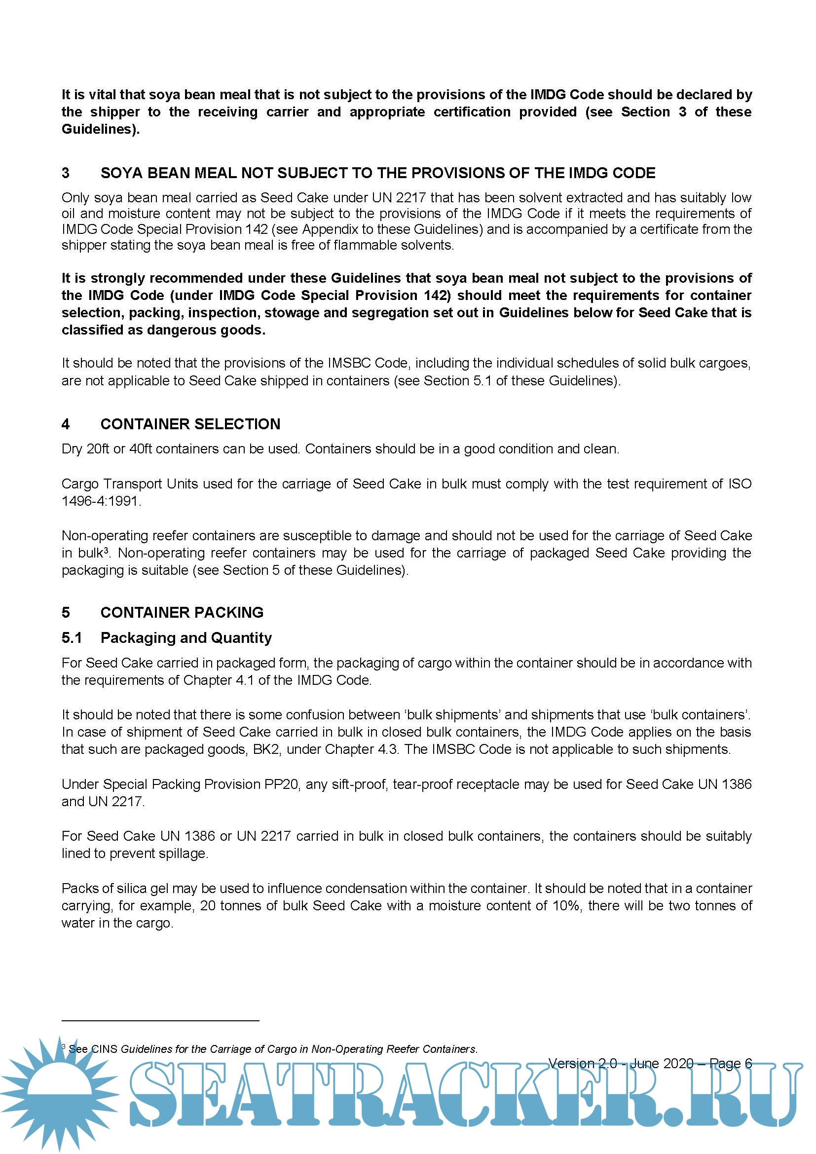 Introduction, Page 2 1 Definition Of Seed Cake, Page 3 2 Cargo Issues, Page 3 3 Soya Bean Meal not Subject to the Provisions of the IMDG Code, Page 6 4 Container Selection, Page 6 5 Container Packing, Page 6 6 Ship Loading, Page 7 Appendix - IMDG Code Special Provisions, Page 8