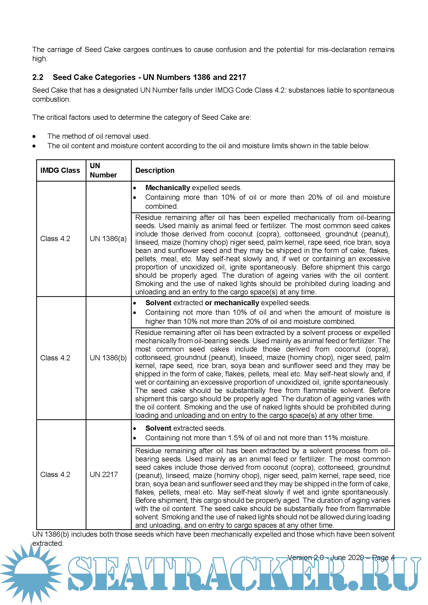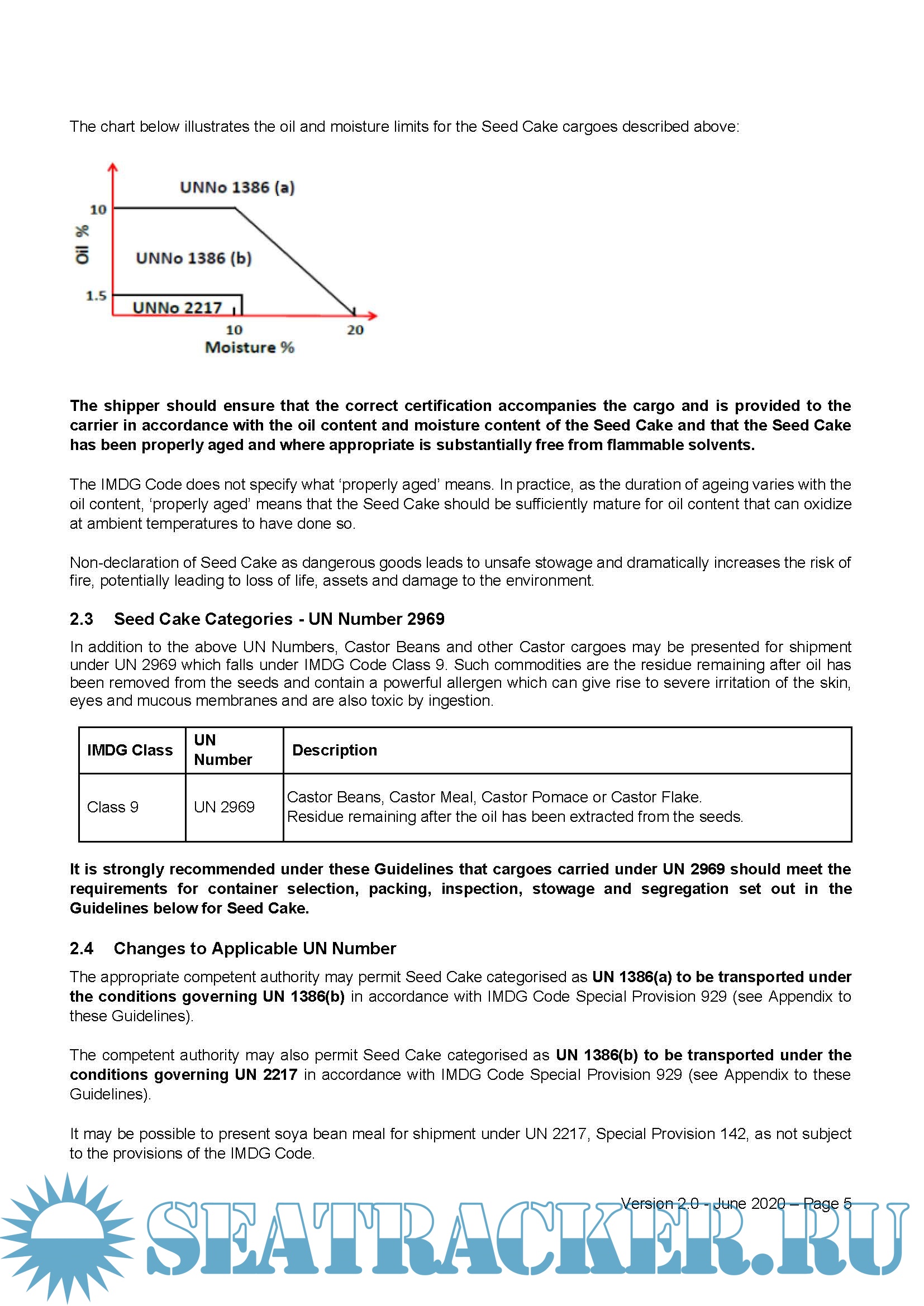 Seed Cake shall be transported in compliance with the requirements set out in the International Maritime Dangerous Goods Code (IMDG Code)2. The practices set out below include selected provisions from the IMDG Code plus additional precautions to enhance its safe carriage.