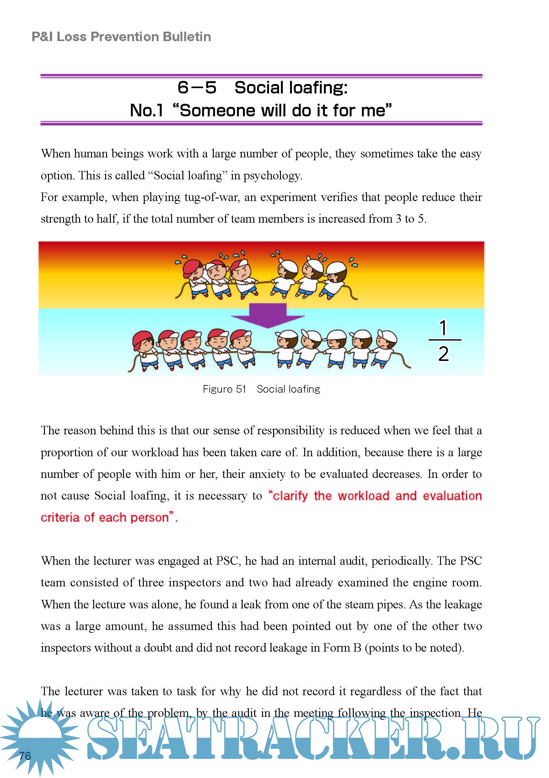 Year: 2020 Language: english Author: Japan P&I Club Genre: Guide Format: PDF Quality: eBook Pages count: 172 Description: Almost 70% of all maritime accidents are said to be caused by human error. Along with damage to harbour facilities brought about by strong gusts of wind and tidal currents during docking work, on examining the root cause, in most cases this was down to inadequate prior inspection and careless mistakes. More than 90% of all maritime accidents are said to be caused by human error. Although it is not possible to eliminate human errors, we consider that having an understanding of the underlying human psychological factors and characteristics may be an effective way to reduce human errors. As a result, we then launched our seminars in 2019 with a focus on psychology. We hope that this will facilitate the reduction of accidents at sea.