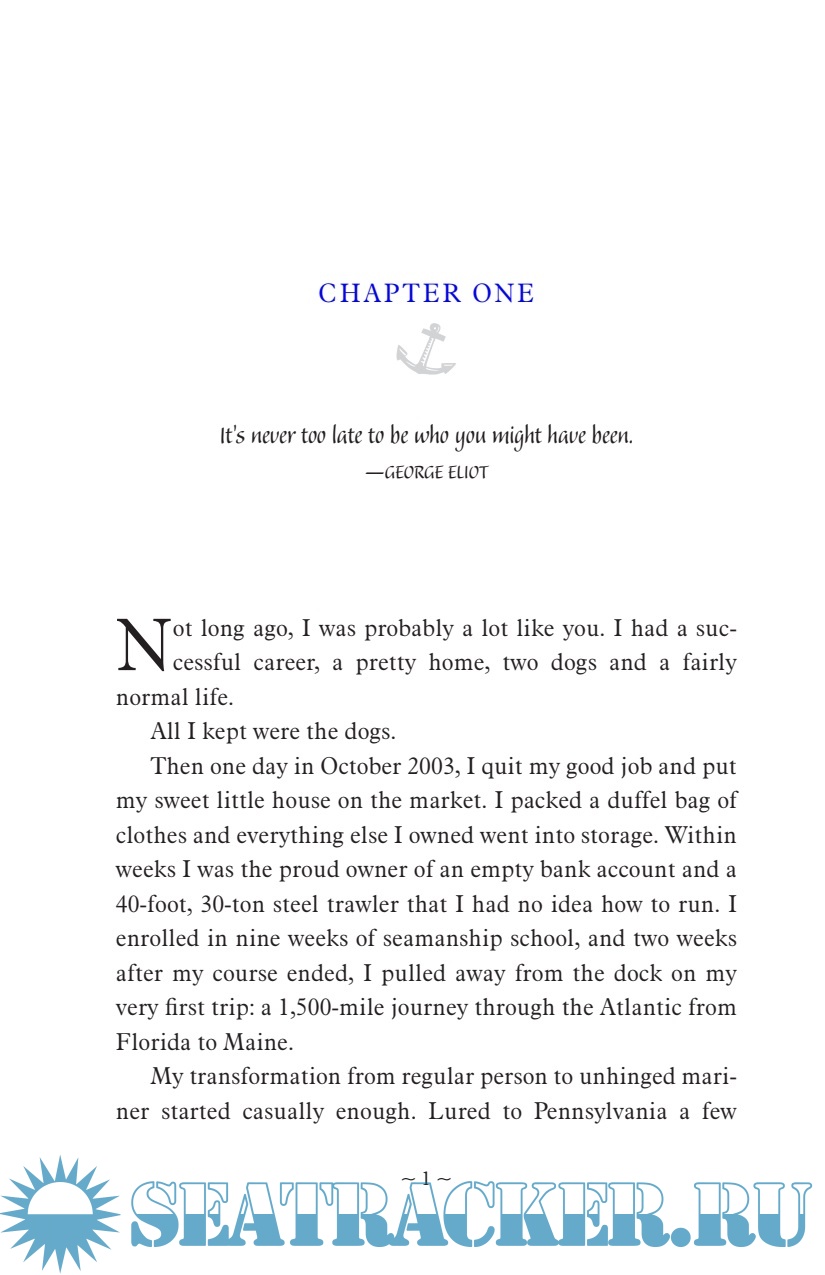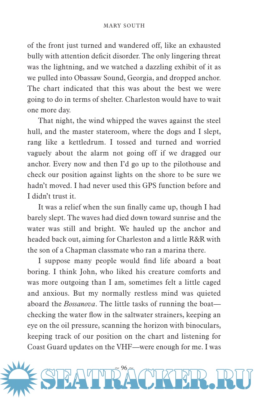 Description: At forty, Mary South had a beautiful home, good friends, and a successful career in book publishing. But she couldn't help feeling that she was missing something intangible but essential. So she decided to go looking for it . . . at sea. Six months later she had quit her job, sold the house, and was living aboard a forty-foot, thirty-ton steel trawler she rechristened Bossanova. Despite her total lack of experience, South set out on her maiden voyage—a fifteen-hundred-mile odyssey from Florida to Maine—with her one-man, two-dog crew. But what began as the fulfillment of an idle wish became a crash course in navigating the complicated byways of the self.