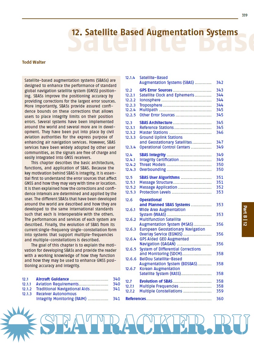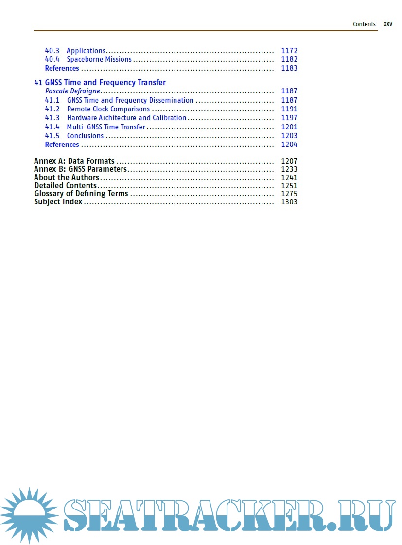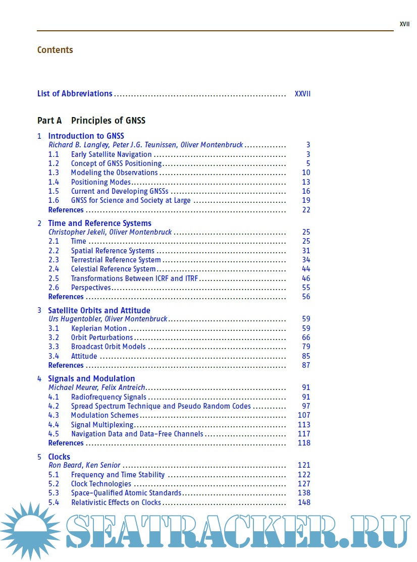 The book is divided in seven distinct parts, each comprising a set of four to eight individual chapters with a common range of topics. For example part A covers the basics of GNSS, in part B one can find a description of all the global, regional, and augmentation systems. Part C presents signal processing, receivers, and antennas. Part D deals with the modern achievements in GNSS algorithms, while part E shows the classical absolute and differential positioning, as well as all the new achievements in precise point positioning and GNSS/INS integration. Part F is dedicated to surveying, geodesy and geodynamics, and Part G to remote sensing and timing. Each of the 41 chapters contains a list of references, from which the reader can deepen the topics. Two annexes show the different receiver and data formats and outline the various GNSS parameters.
