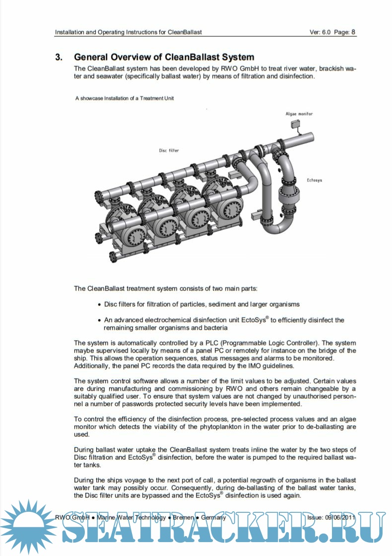 Description: The CleanBallast system has been developed by RWO GmbH to treat river water, brackish water and seawater (specifically ballast water) by means of filtration and disinfection.