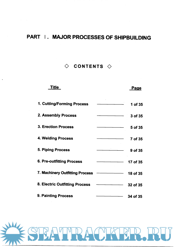 Year: 2005 Language: english Author: Daewoo Shipbuilding & Marine Engineering Co., Ltd Genre: Technical book Format: PDF Quality: Scanned pages Pages count: 134 Description: This Daewoo Shipbuilding Quality Standard is to standardize the quality control practice for all kinds of Cargo Ships, Barges, Drilling Rigs, Gas Carriers and also Steel Structures. This booklet consists of following three parts: Part 1 -- Major processes of shipbuilding Part 2 -- Inspection and test items Part 3 -- Quality standards