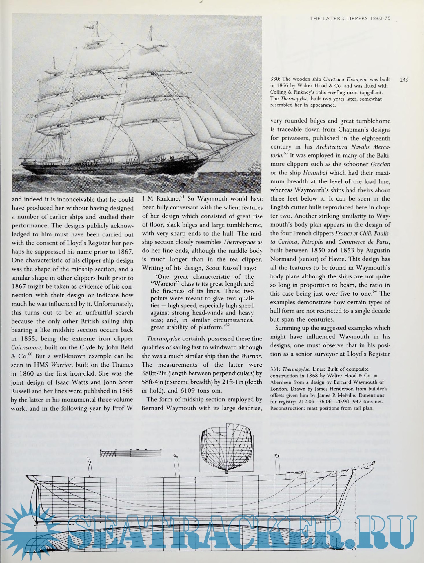 Year: 1988 Language: english Author: MacGregor D.R. Genre: History Publisher: Naval Institute Press ISBN: 0870218956 Format: PDF Quality: Scanned pages Pages count: 324 Description: English Maritime History is noted for its high standards of excellence. It has examined its naval history in depth, the growth of its national merchant marine and of its important trades, including the national fisheries. Operations, economic effects, and social relations of many trades have been studied. It has recorded the lives of great English navigators and explorers, described the lives of seamen in commercial and naval services. It has discussed the national maritime policies in various periods and many other matters. English maritime history had the support of active nautical research studies by members of the Society for Nautical Research, much of which has been published in the Mariner’s Mirror, journal of the society. However, in spite of all this, there has been an important area of neglect; the history of the evolution of the fast-sailing vessels in the English merchant marine and in their naval service, utilizing contemporary ship plans as evidence. This is different from American practice, in which the evolution of American naval architecture is an important historical factor. As a result, ship plans are employed in America as technical evidence; these are the foundations for many historical conclusions. For example, a claim that a vessel was a clipper is accepted only if a plan, half-model, or a surviving technical description verify the claim. The plans or halfmodels are visible evidence of the shape of the hull of the vessels in both cases and sometimes of the rig in plans. Usually the lines of a ship, for which a half-model exists, are ‘taken off and converted to a plan of the hull, as a convenience. There are instances where extensive technical descriptions of individual ships are in existence, adequate to justify acceptance as evidence of hull-form, but these are relatively rare. The criterion of excellence of sailmg ship design has been speed, by common consent, therefore the fastest ship of a type would be the ‘best design’. However, the suitability of a ship for her trade would undoubtedly be a more realistic evaluation for such a judgement, but it is very difficult to assess. The apparent neglect of the history of English naval architecture by English marine historians has been puzzling, particularly so because of the immense collections of ship plans preserved in England. The greatest of these and probably the largest in the world is the Admiralty Collection of Draughts preserved in the National Maritime Museum at Greenwich. This collection contains contemporary plans of sailing ships built between 1675 and 1875, or later. Predominantly the plans are of men-of-war built for, or captured by, the Royal Navy. However, there are also many merchant ship plans in the collection, English and foreign. In addition there are surviving plans in some of the Old English shipyards and in private hands, which are large and important collections. The Admiralty Collection of Draughts contains the most complete and valuable plans of American sailing vessels between 1745 and 1845 so this collection of plans has been a very valuable source to American students, if to few English historians. The excuse for the neglect of the history of English naval architecture has been that ship plans and professional data are ‘too technical’ for English readers. The American practice of utilizing numerical factors in the analysis of a ship design gives some support to this excuse. These factors did not prove very decisive in analysis, however, and visual comparison was found adequate. Experience and publication showed that plans were understood to far greater extent than had previously been thought to be the case. It should be acknowledged that ship-model builders have been of great assistance in this; their need for an understanding of plans is obvious. In view of what has been said about the state of the history of English naval architecture this work is a great departure. Through its use of plans, as historical evidence, the true evolution of English fast-sailing ship designs becomes well-defined. In addition, the development of English vessel types such as the cutter and three-masted lugger, are brought to attention. It will be found that the history of English sailing merchant ship design is outlined, showing ships of various classes — in the eighteenth and nineteenth centuries. The history of iron ship design and construction in England, the leader in this, is traced. Also, the development of composite construction is examined. The ubiquitous clipper ship receives attention and all classes of these that were developed in England, are shown, with liberal use of plans. Ships that have not been previously introduced, in English clipper ship history, are brought to light. It will now appear that English construction and evolution of clipper ship design paralleled American development and construction of the extreme clipper ship model. The part played by iron construction in the evolution of extreme clipper ship in England is particularly interesting. The claims that English designs were influenced by American principles are completely exploded. The comparative developments can now be explored and the history of the clipper revised and corrected.
