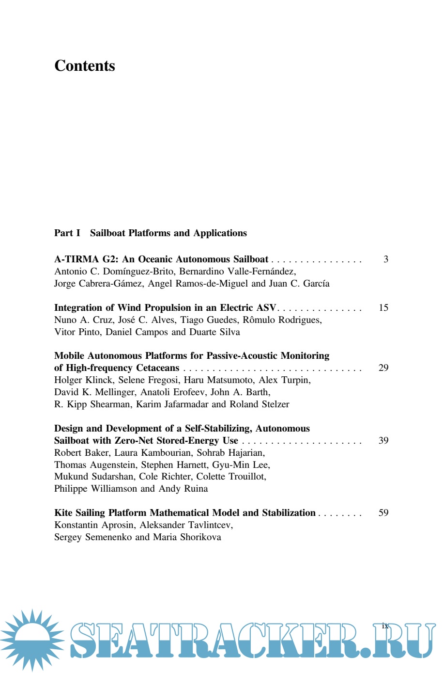 Year: 2016 Language: english Author: Friebe A., Haug F. (eds.) Genre: Conference Publisher: Springer International Publishing Edition: 1st ISBN: 978-3-319-23335-2 Format: PDF Quality: Scanned pages Pages count: 163 Description: This book presents the cutting edge developments within a broad field related to robotic sailing. The contributions were presented during the 8th International Robotic Sailing Conference, which has taken place as a part of the 2015 World Robotic Sailing Championships in Mariehamn, Åland (Finland), August 31st – September 4th 2015. Since more than a decade, a series of competitions such as the World Robotic Sailing Championship have stimulated a variety of groups to work on research and development around autonomous sailing robots, which involves boat designers, naval architects, electrical engineers and computer scientists. While many of the challenges in building a truly autonomous sailboat are still unsolved, the books presents the state of the art of research and development within platform optimization, route and stability planning, collision avoidance, power management and boat control.