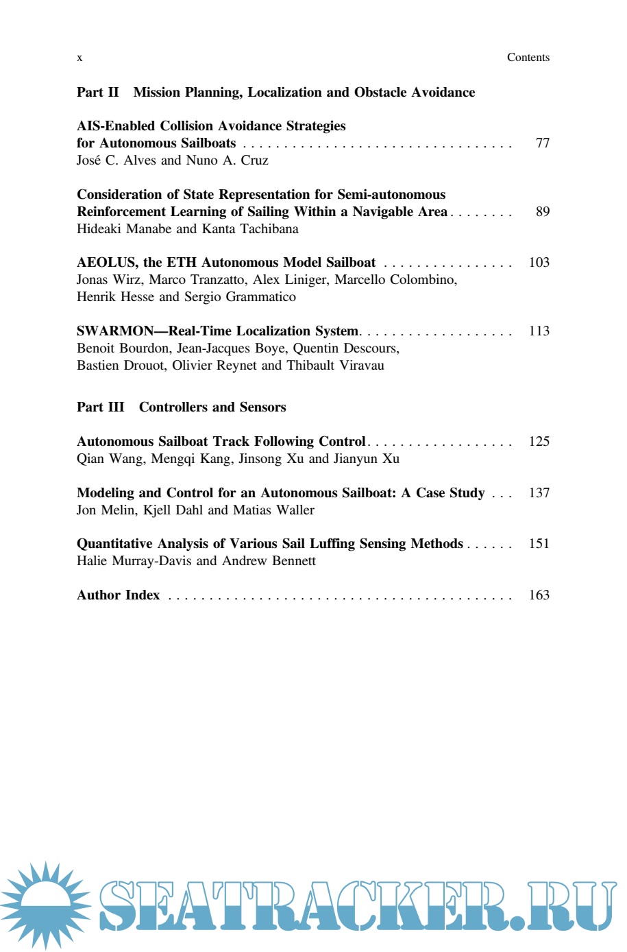 Since more than a decade, a series of competitions such as the World Robotic Sailing Championship have stimulated a variety of groups to work on research and development around autonomous sailing robots, which involves boat designers, naval architects, electrical engineers and computer scientists. While many of the challenges in building a truly autonomous sailboat are still unsolved, the books presents the state of the art of research and development within platform optimization, route and stability planning, collision avoidance, power management and boat control.