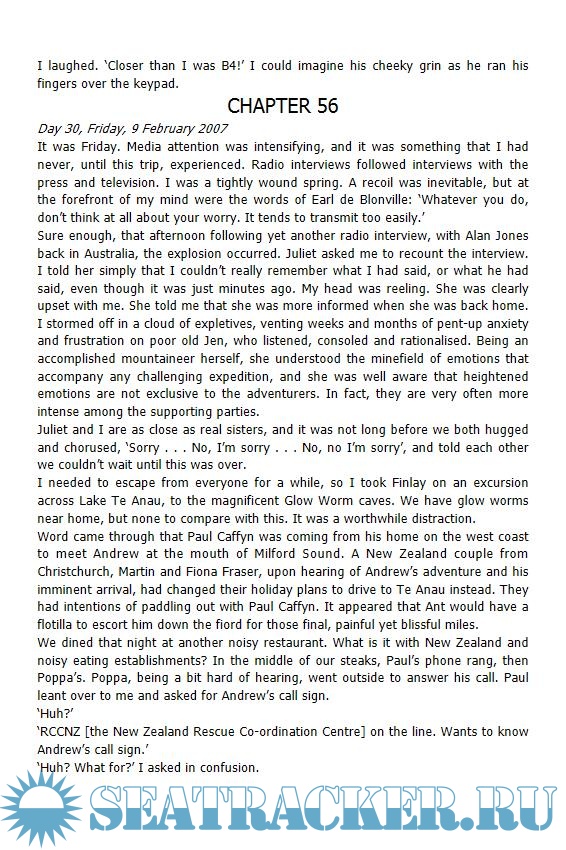 Year: 2010 Language: english Author: McAuley A. @ V. Genre: History Publisher: Pan Macmillan Australia ISBN: 1405040130 Format: PDF Quality: Scanned pages Pages count: 232 Description: On January 11th 2007, Andrew McCauley set off from Tasmania in a sea Kayak, aiming to be the first person to paddle the 1600 kms to New Zealand. A month later, NZ authorities received a garbled distress call from him. His Kayak was spotted drifting just 80 kms from NZ. His wife writes his adventure story.