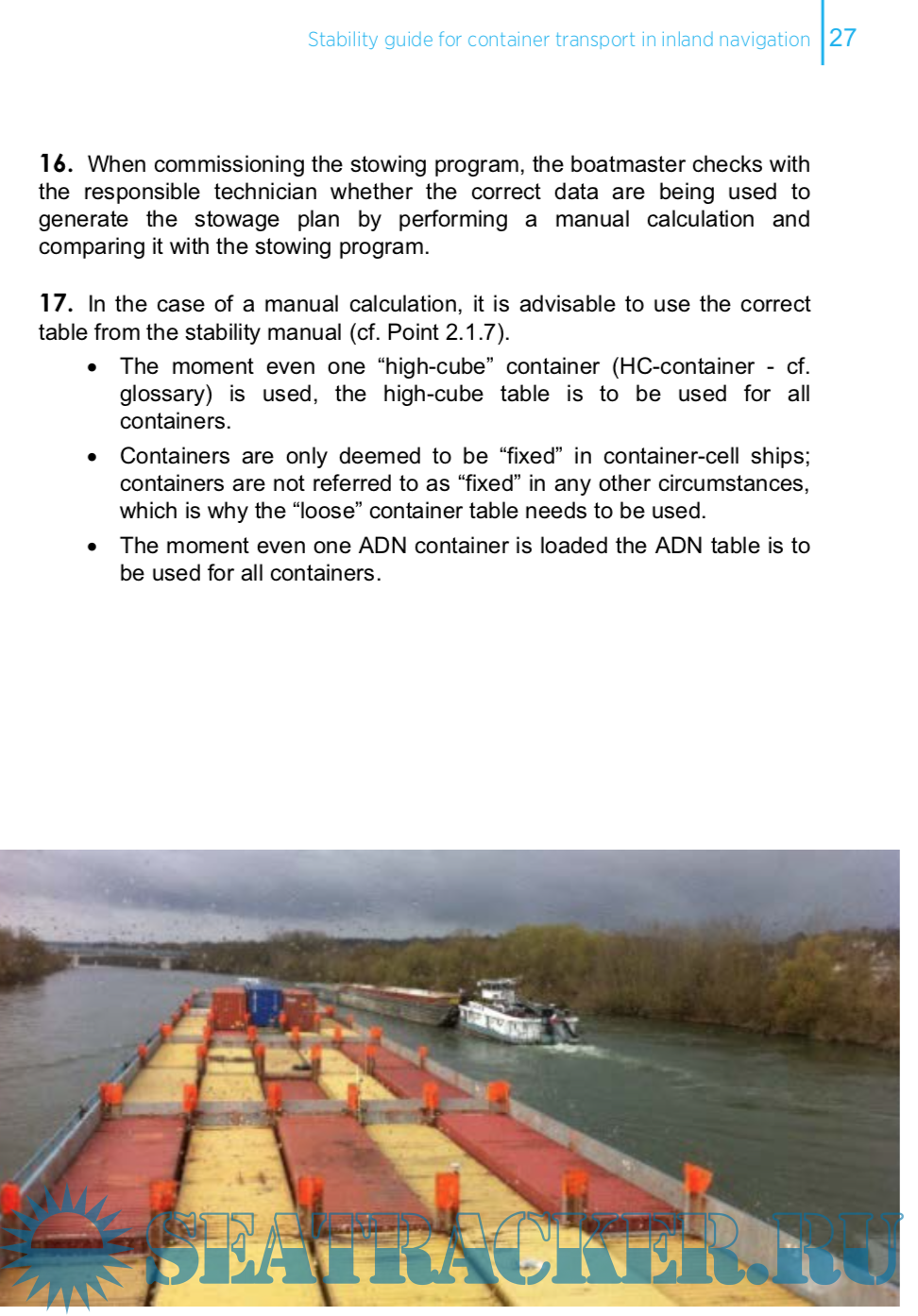 Year: 2017 Language: english Author: The Central Commission for the Navigation of the Rhine (CCNR) Genre: Guide Publisher: The Central Commission for the Navigation of the Rhine (CCNR) Format: PDF Quality: eBook Pages count: 42 Description: Container transport by inland waterway vessel is a particularly safe form of transport. Every year, millions of containers are transported safely and sustainably between the seaports on the one hand and hinterland terminals along the Rhine and other inland waterways on the other hand. Nevertheless, there have been a number of accidents in recent years from which lessons can be learned. For example, in the spring of 2007 the Excelsior lost 31 containers, resulting in the Rhine being completely closed to navigation for more than a week. Also in the spring of 2007, 30 containers were lost overboard by the Arc-en-Ciel on the Seine, bringing navigation to a halt for a week. The Ferox capsized in Rotterdam in 2006. The examples mentioned go to show that notwithstanding the fact that container transport is very safe, accidents do occur, which are attributable to stability defects. Stability defects can have a number of causes: incorrect stowage, incorrect information, for example about container weights, but insufficient knowledge of stability-related parameters may also play a role. Stability is indeed part and parcel of inland waterway boatmen’s general training but it bears pointing out that ensuring that all inland navigation crews’ level of knowledge is kept up to the mark at all times is an important task. With this in mind, the industry (ESO, EBU), Aquapol and CCNR have decided to publish this guide to good practice. This guide illustrates in an easy-to-remember way the basic principles of stability and tried and tested real-life examples with a positive impact on stability