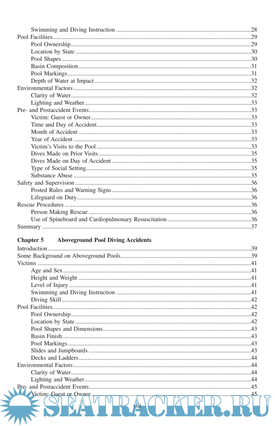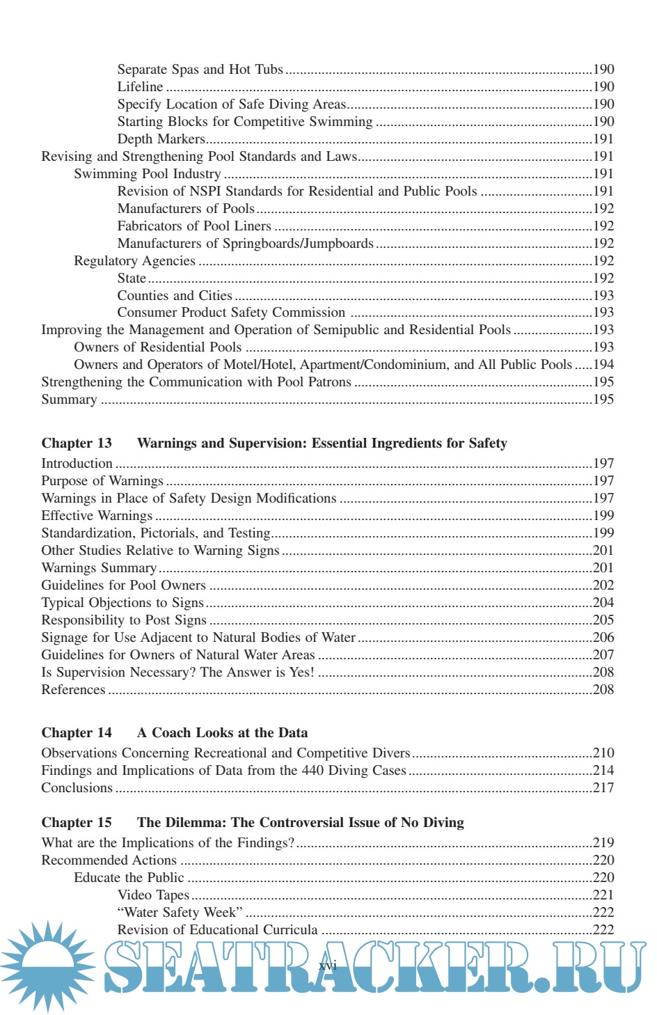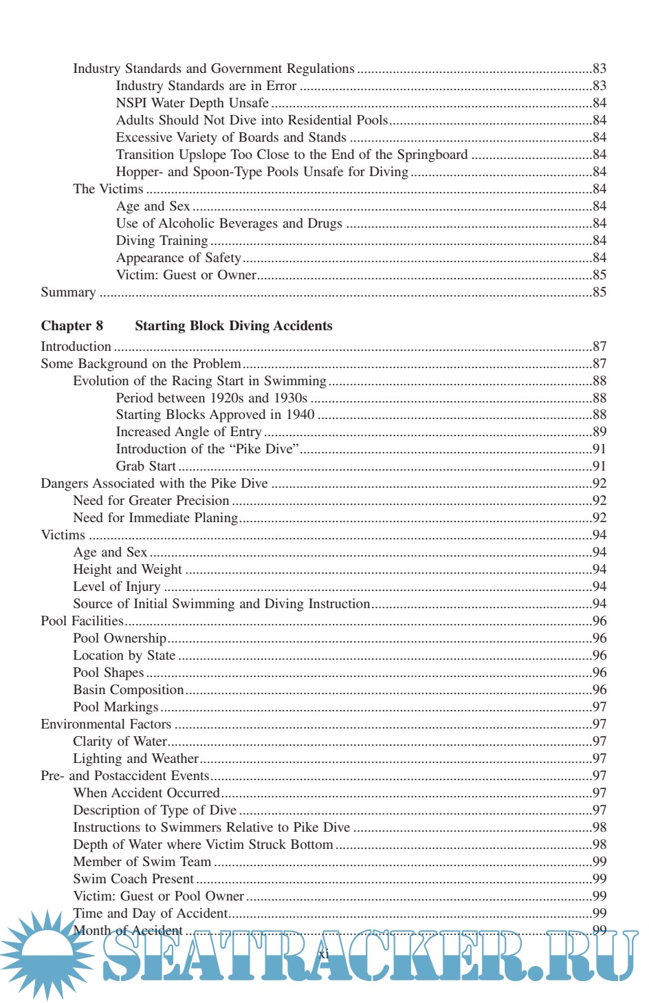 Year: 2000 Language: english Author: Gabrielsen M. Genre: Manual Publisher: CRC Press Edition: 1st ISBN: 0849323703 Format: PDF Quality: Scanned pages Pages count: 273 Description: Diving Injuries: Research Findings and Recommendations for Reducing Catastrophic Injuries represents the most comprehensive study ever done on the problem of spinal cord injuries resulting from diving into water. ng injuries. In it, Dr. Gabrielsen, a renowned expert on the interpretation and presentation of diving-related testimony, discusses injuries sustained in swimming pools, lakes, rivers, and oceans; the laws, standards, and regulations for swimming pool design; and the cost of medical and rehabilitative care for spinal cord injury victims. The book provides a greater understanding of diving safety from all perspectives and is an indispensable reference guide to the safety conscious.