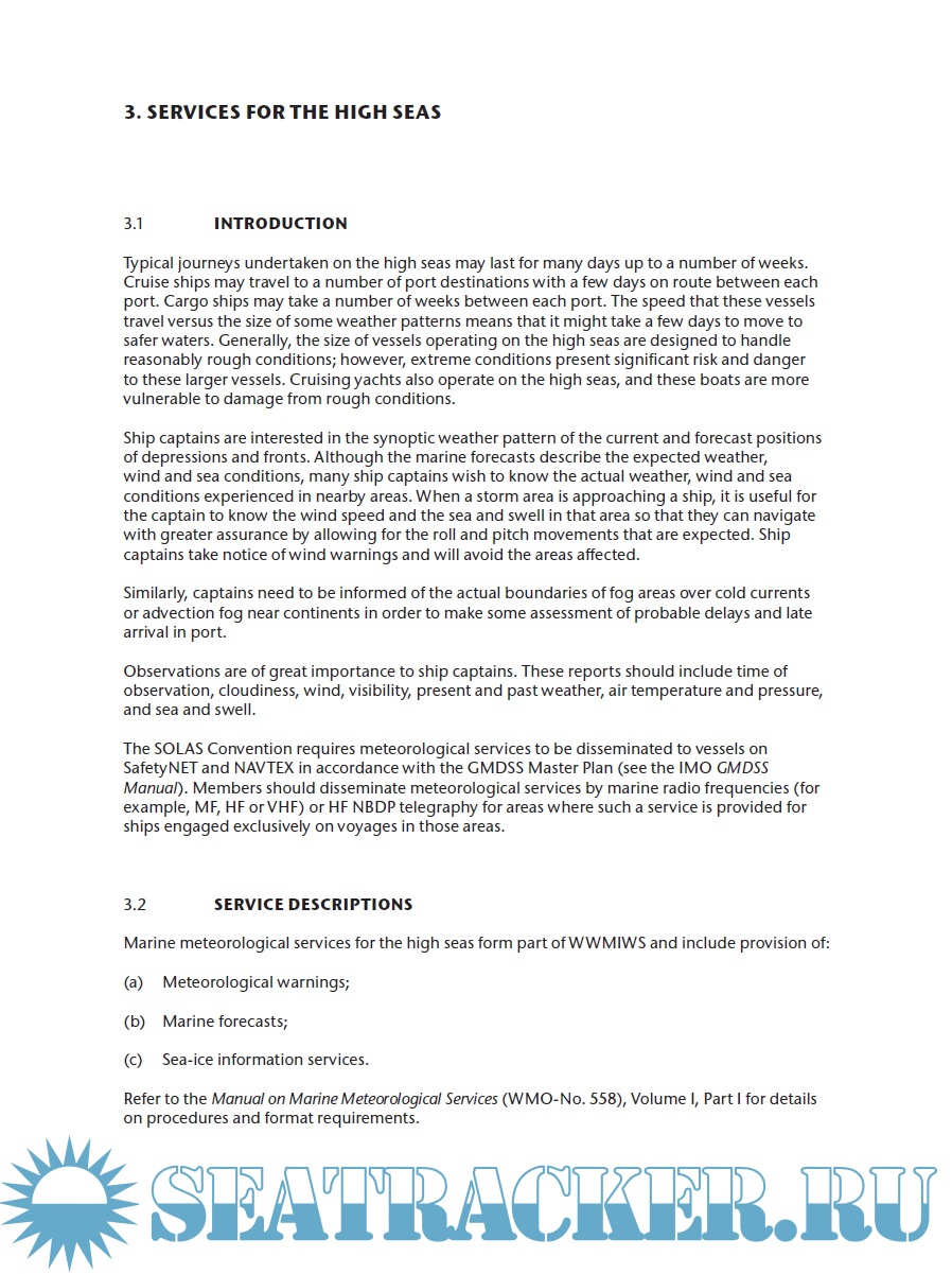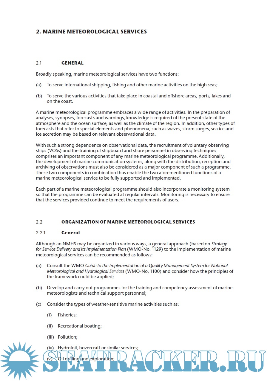 The purpose of this Guide is to complement the Manual by describing the requirements for each service, explaining the rationale for the agreed methods of providing services, and giving guidance on how to set up and maintain marine meteorological services.