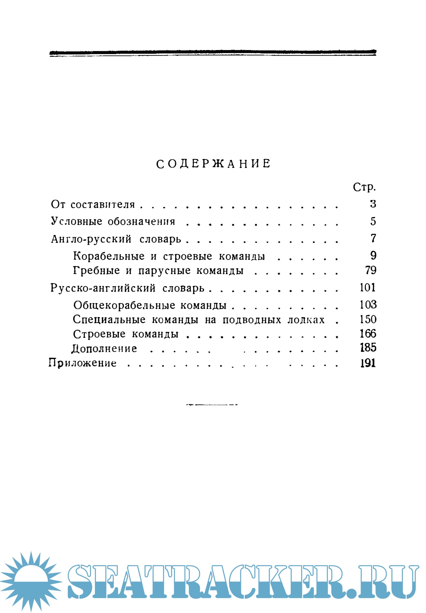 Содержание: От составителя Англо-русский словарь Корабельные и строевые команды Гребные и парусные команды Русско-английский словарь Общекорабельные команды Специальные команды на подводных лодках Строевые команды ДОПОЛНЕНИЕ к русско-английской части словаря по разделу «Специальные команды на подводных лодках» Приложение Содержание