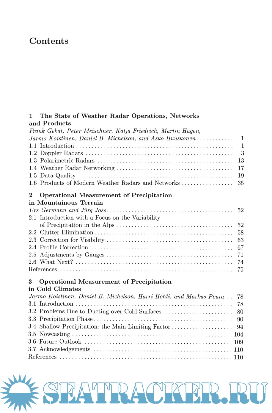Year: 2004 Language: english Author: Meischner P. (eds.) Genre: Technical book Publisher: Springer-Verlag Berlin Heidelberg Edition: 1st ISBN: 978-3-662-05202-0 Format: PDF Quality: Scanned pages Pages count: 351 Description: Weather radar systems provide data necessary for the understanding of weather systems, improved forecasts (especially critical for severe weather), hydrological applications, flood warnings and also for climate research in which ground verification is needed for global precipitation measurements by satellites. This book offers an accessible overview of advanced methods, applications and modern research from the European perspective. An extensive introductory chapter summarizes the principles of weather radars and discusses the potential of modern radar systems, including Doppler and polarisation techniques, data processing, and error-correction methods. Addressing both specialist researchers and nonspecialists from related areas, this book will also be useful for graduate students wishing to specialize in this field.