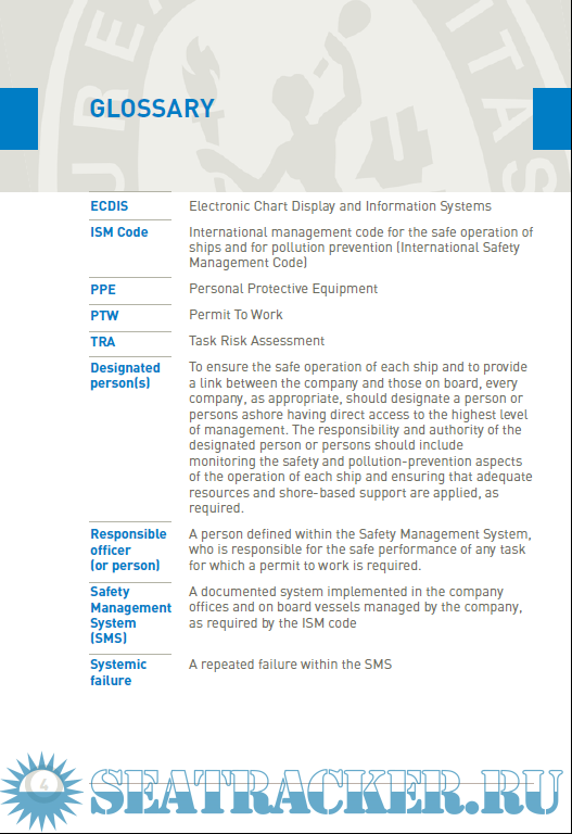 ECDIS ISM Code PPE PTW TRA Designated person(s) Responsible officer (or person) Safety Management System (SMS) Systemic failure Electronic Chart Display and Information Systems International management code for the safe operation of ships and for pollution prevention (International Safety Management Code) Personal Protective Equipment Permit To Work Task Risk Assessment To ensure the safe operation of each ship and to provide a link between the company and those on board, every company, as appropriate, should designate a person or persons ashore having direct access to the highest level of management. The responsibility and authority of the designated person or persons should include monitoring the safety and pollution-prevention aspects of the operation of each ship and ensuring that adequate resources and shore-based support are applied, as required. A person defined within the Safety Management System, who is responsible for the safe performance of any task for which a permit to work is required. A documented system implemented in the company offices and on board vessels managed by the company, as required by the ISM code A repeated failure within the SMS