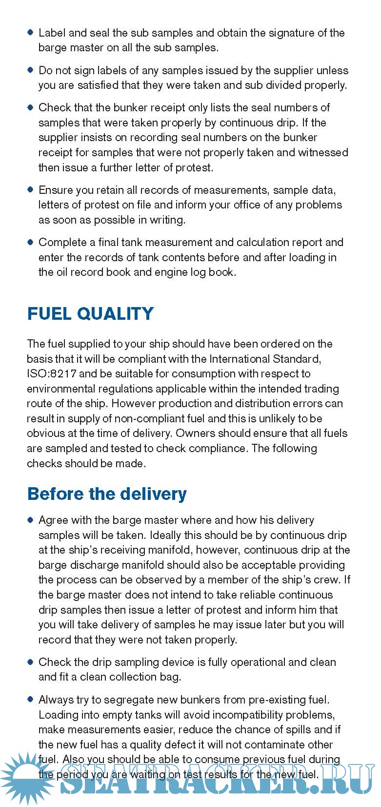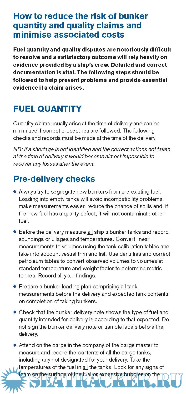 Year: 2012 Language: english Author: Thomas Miller Genre: Guide Publisher: UK P&I Club Format: PDF Quality: eBook Pages count: 8 Description: The P&I publication addressing the reduction of the potential claims and costs associated with the bunkering. It is intended to provide the crew members and other interested parties with the information that would help them with reducing of the risks of both quality and quality claims and also with minimization of the associated costs.
