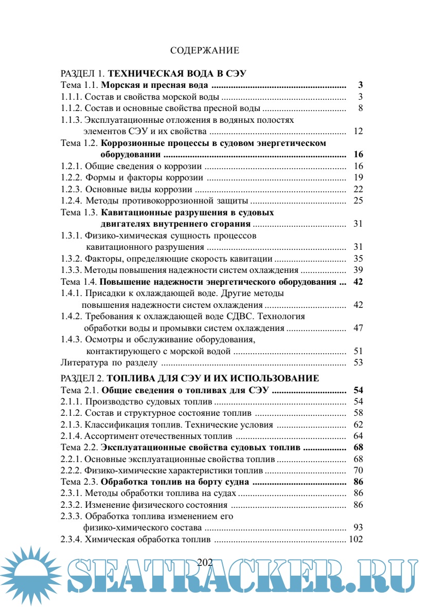 Описание: Рассмотрены основные физико-химические характеристики рабочих сред судового энергетического оборудования – воды, топлива и смазочных материалов. Даны характеристики их эксплуатационных свойств. Проанализированы методы и технологические схемы обработки рабочих сред в судовых условиях, критерии, по которым осуществляется выбор топлив и масел для судовых двигателей и вспомогательных котлов. Особое внимание уделено рассмотрению влияния качества воды и горюче-смазочных материалов на надежность и экономичность судовых энергетических установок.