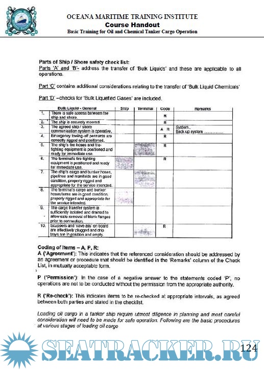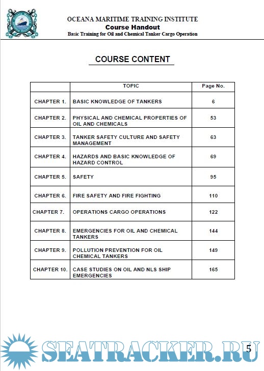 Year: 20xx Language: english Author: Oceana Maritime Training Institute Genre: Training courses Publisher: Oceana Maritime Training Institute Format: PDF Quality: eBook Pages count: 169 Description: AIM === This course provides training to candidates to be duly qualified under Section A – V/1-1 of the STCW code with specific duties and responsibilities related to cargo equipment on oil and chemical tankers, It comprises of a basic training programme appropriate to their duties, including basic training for oil and chemical tanker safety, fire safety measures, pollution prevention, safe operational practices and obligations under applicable law and regulations. The course covers the competence requirements as given in the table A-V/1-1-1 of the STCW Code adopted by the International Convention on Standards of Training. Certification and Watchkeeping for Seafarers, 1978 as amended in 2010. Objective ========= Provided they hold an appropriate certificate and are otherwise qualified in accordance with regulation Section A-VI/1 of the International Convention on Standards of Training, Certification and Watch keeping for Seafarers 1978, as amended, those successfully completing the course will be eligible to carry out assigned specific duties and responsibilities related to cargo or cargo equipment on Oil and Chemical Tankers. The trainee shall: • Be familiar with the equipment, Instrumentation and controls used for cargo handling on an oil and chemical tanker. • Have acquired greater awareness of the need of proper planning and the use of checklists involved in various cargo handling operations. • Have an enhanced awareness to apply proper and safe procedures at all times when carrying out the various operations on board oil and chemical tankers. • Be able to identify operational problems and assist in solving them. • Follow safety practices and protect the marine environment. • Be able to assist and co-ordinate actions during emergencies.