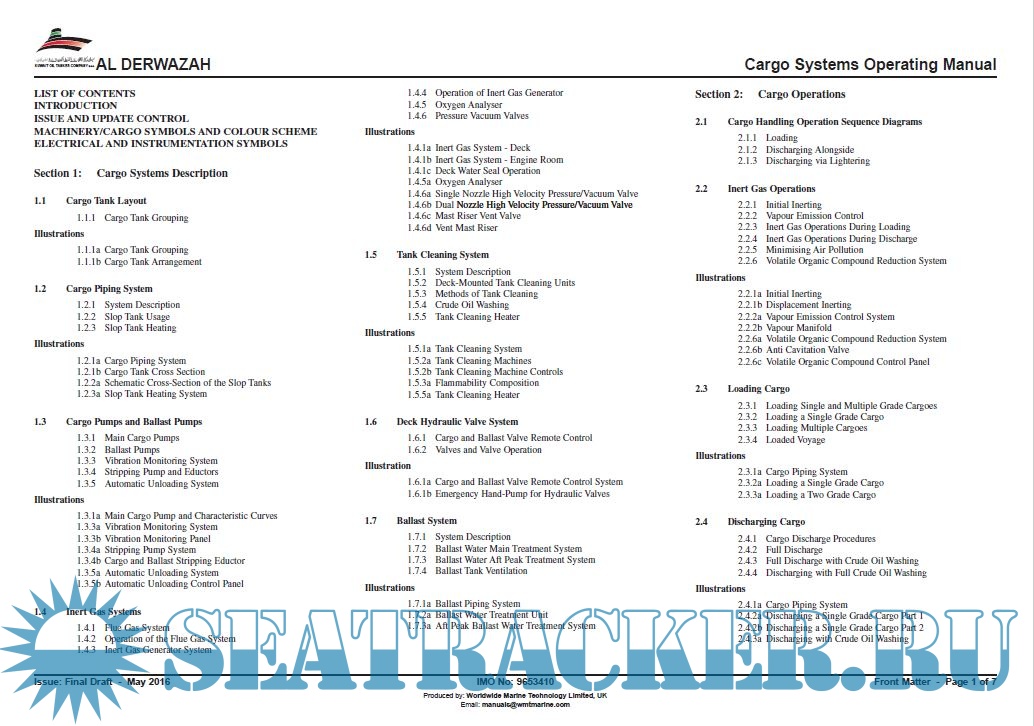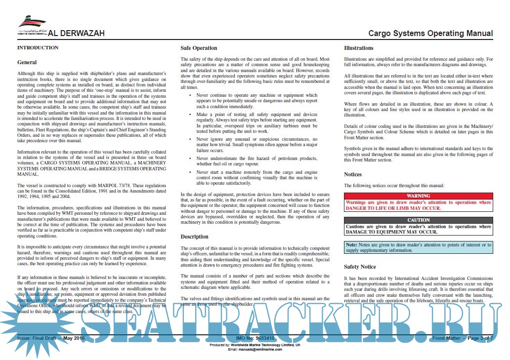 Description: The concept of this manual is to provide information to technically competent ship’s officers, unfamiliar to the vessel, in a form that is readily comprehensible, thus aiding their understanding and knowledge of the specific vessel. Special attention is drawn to emergency procedures and fire fighting systems.