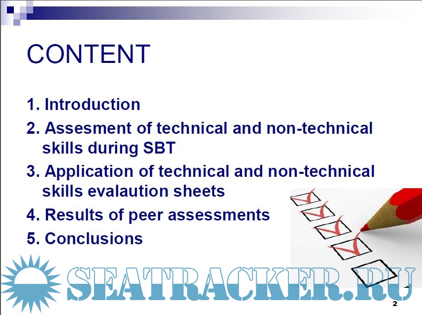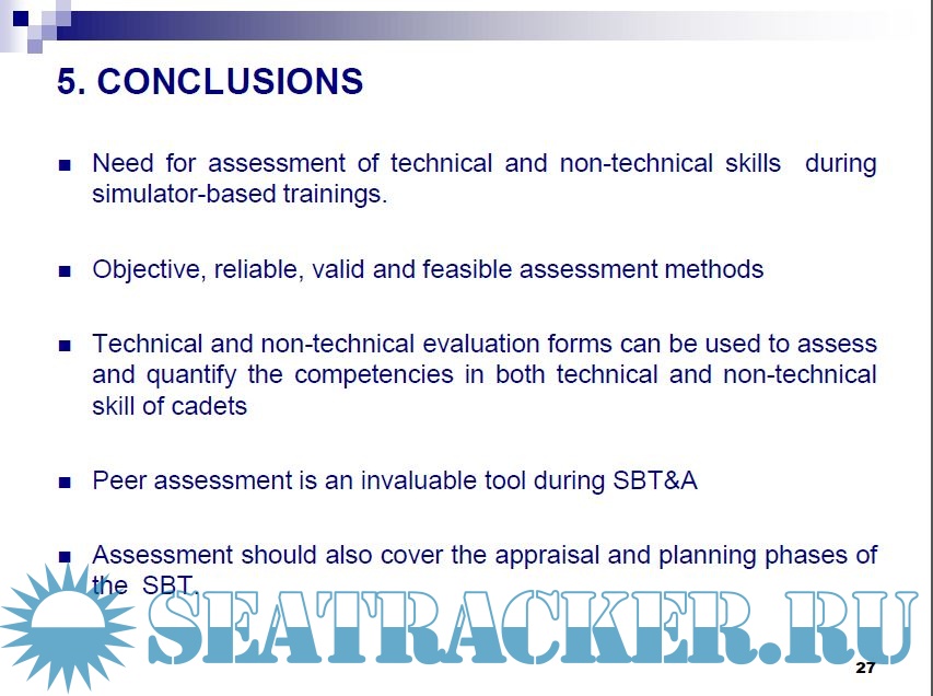 Year: 2014 Language: english Author: Ender Asyali Genre: Training courses Publisher: Massachusetts Maritime Academy, USA Format: PDF Quality: Photo of pages Pages count: 28 Description: According to Code, where simulators are used to assess the ability of candidates to demonstrate levels of competency, assessors shall ensure that: 1- Identified performance criteria are clearly and explicitly and are valid and available to the candidates; 2- Assessment criteria are established clearly and are explicit to ensure reliability and uniformity of assessment and to optimize objective measurement and evaluation, so that subjective judgments are kept to the minimum; 3- Candidates are briefed clearly on the tasks and/or skills to be assessed and on the tasks and performance criteria by which their competency will be determined; 4- Assessment of performance takes into account normal operating procedures and any behavioral interaction with other candidates on the simulator or with simulator staff; 5- Scoring or grading methods to assess performance are used with caution until they have been validated; 6- The prime criterion is that a candidate demonstrates the ability to carry out a task safely and effectively to the satisfaction of the assessor.