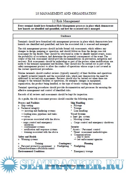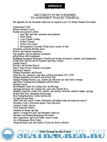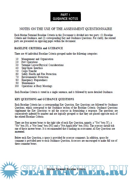 Description: The Marine Terminal Baseline Criteria and Assessment Questionnaire has been published by the Oil Companies International Marine Forum (OCIMF) to encourage the uniform assessment of standards of safety and environmental protection at chemical, gas, and oil terminals. This publication supercedes the Marine Terminal Survey Guidelines published in 1995 by OCIMF with the assistance of the Society of International Gas Tanker and Terminal Operators (SIGTTO). The Baseline Criteria are written for the assessment of fixed piers, sea islands and buoy mooring terminals. They are not intended for use at producing facilities such as offshore platforms and deepwater loading systems, although the contents could be adapted for such purpose.