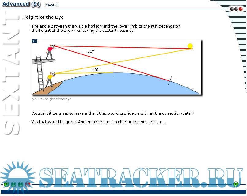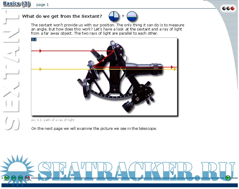 Additional info (rus): Тут можно убить сразу двух зайцев: во-первых, это очень неплохая тренировка английского языка, а во-вторых, хороший тренинг для начинающих изучать мореходную астрономию. Это своеобразный курс теоретико-практических лекций по использованию секстанта и вычислению координат места судна. Конечно, там есть определенные недостатки, но для начинающих этот курс будет весьма полезен.