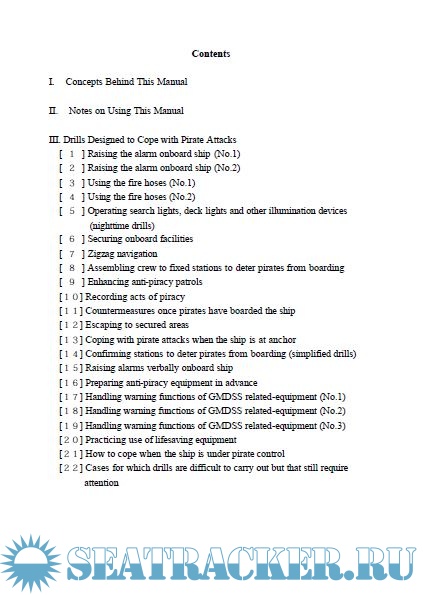 Year: 2004 Language: english Author: Japan Maritime Research Institute Genre: Manual Publisher: Japan Maritime Research Institute Format: PDF Quality: eBook Pages count: 78 Description: As a study in the fiscal year 2003, Japan Maritime Research Institute made a guiding manual for Japanese operators of ocean going ships, its operating ships, and relevant parties on concrete ways to deter pirate attacks and effective drills for onboard anti-piracy. Also it is aimed that the parties concerned to be thoroughly aware of what should be done. This manual is written in conversation form based on scenarios considering various situations such as finding a suspicious boat, excluding intruders by discharging water, etc, being under control by armed pirates, and is shown in Japanese-English.