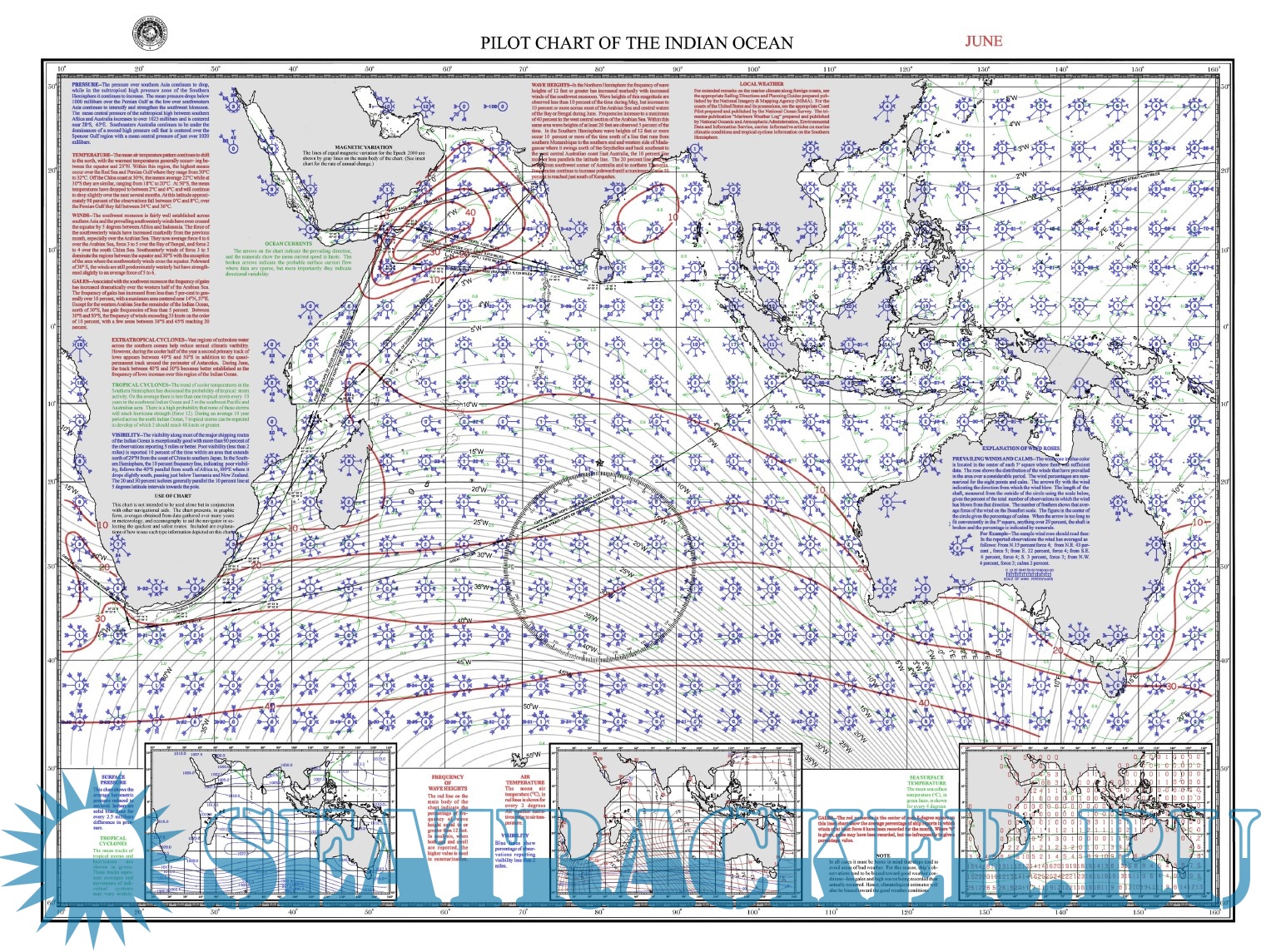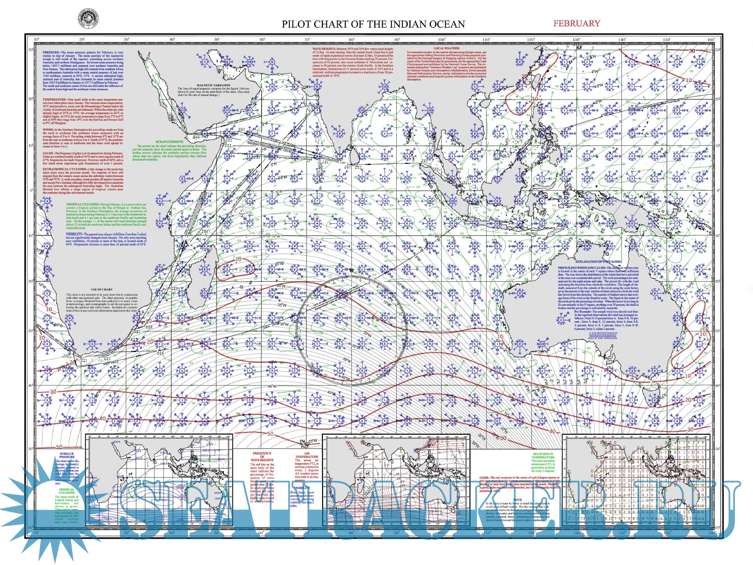 Year: 2001 Language: english Author: NGA (formerly NIMA, DMA) Genre: Other Publisher: NGA (formerly NIMA, DMA) Edition: 4th Format: PDF Quality: Scanned pages Pages count: n/a Description: The Atlas of Pilot Charts set is comprised of five volumes, each covering a specific geographic region. Each volume is an atlas of twelve pilot charts, each chart is compiled using average conditions over a single month of any given year. Pilot Charts depict averages conditions of winds, currents, temperatures, wave heights, ice limits, visibility, barometric pressure, and weather conditions. The purpose is to aid the navigator in selecting the fastest or safest routes with regards to the expected weather and ocean conditions. The charts are not intended to be used for navigation. This volume contains the Atlas of Pilot Charts of the Indian Ocean, Pub. 109, 4th Ed