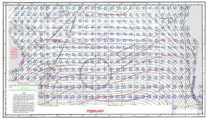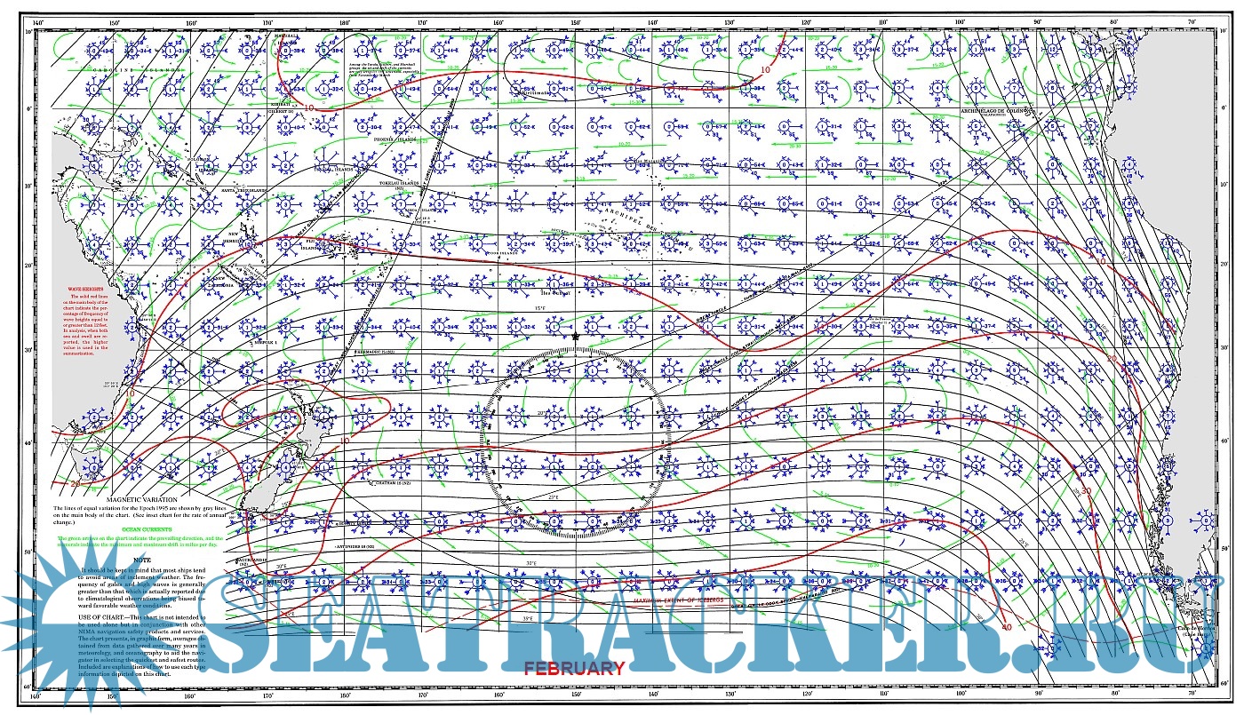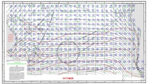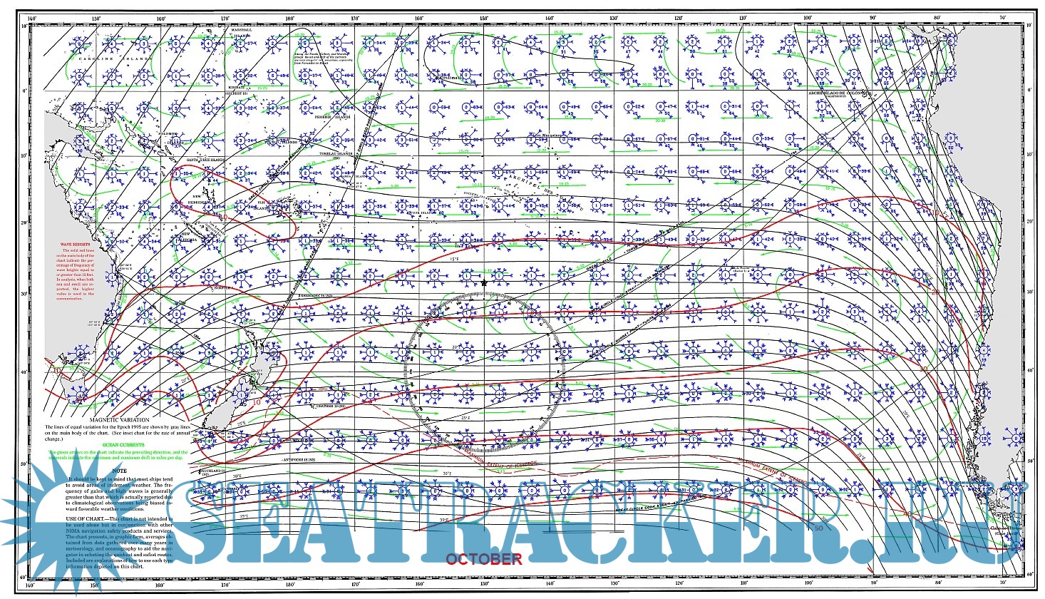 Description: The Atlas of Pilot Charts set is comprised of five volumes, each covering a specific geographic region. Each volume is an atlas of twelve pilot charts, each chart is compiled using average conditions over a single month of any given year. Pilot Charts depict averages conditions of winds, currents, temperatures, wave heights, ice limits, visibility, barometric pressure, and weather conditions. The purpose is to aid the navigator in selecting the fastest or safest routes with regards to the expected weather and ocean conditions. The charts are not intended to be used for navigation.