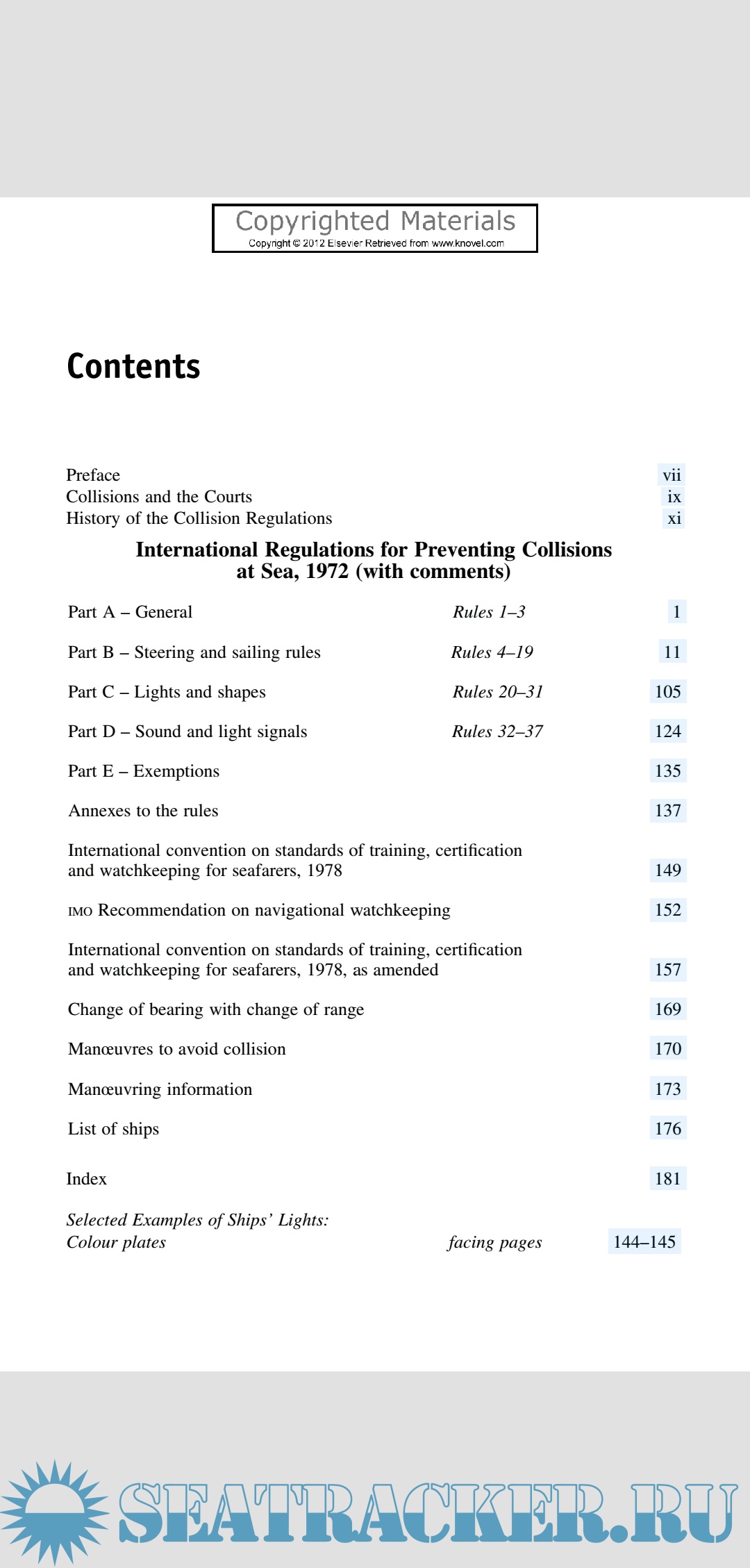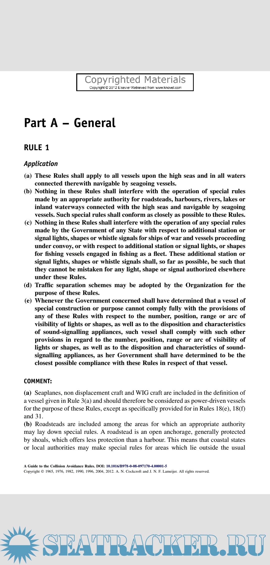 Year: 2012 Language: english Author: A. N. Cockcroft and J. N. F. Lameijer Genre: Guide Format: PDF Quality: eBook Pages count: 259 Description: When the Regulations for Preventing Collisions at Sea were revised at an International Conference held in 1960 the changes made were generally of minor character. Soon after the amended Regulations came into force in 1965 it became apparent that a more thorough revision was necessary to take account of such developments as the widespread acceptance and use of radar, the introduction of trafic separation and the increase in size and speed of many ships. At an International Conference held in October 1972 substantial changes were made and a new format was adopted. The 1972 Regulations came into force in 1977.