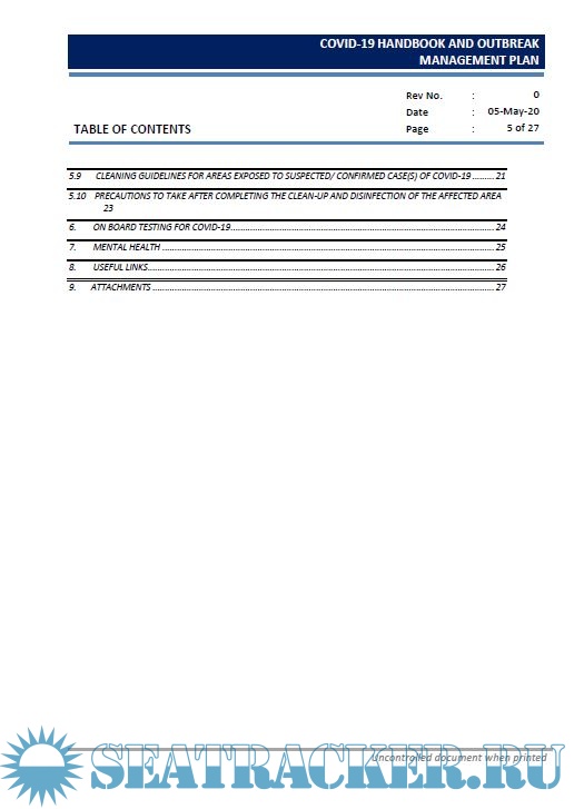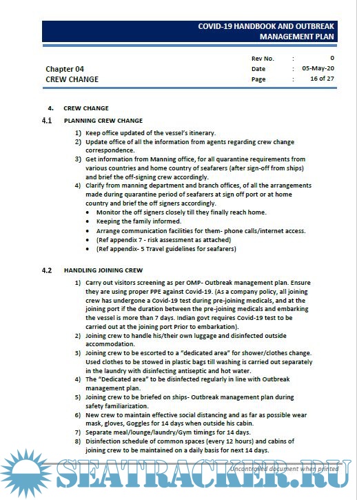 Description: This Covid-19 handbook and outbreak management plan provides procedures to be put in place to prepare Synergy ships for ‘ship-shore” interface and to protect our seafarers from the dangers posed by the new Coronavirus disease (Covid-19). These includes potential exposure from shore personnel and the actions to be taken in the event of a suspected case on board.