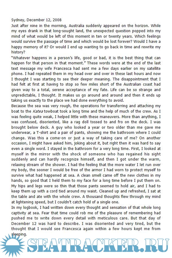 After writing down his thoughts, day after day, he made us feel what all this time in the sea, alone, meant for him: “it was as though the world of lands above sea level suddenly had disappeared.” Indeed, when time becomes endless we are able to understand what really matters in the life on a man. Alex learned that the value of a man cannot be judged measuring his successes, but with the dreams that keep him alive. In his book he also tells the love story with his wife Francesca, that gave him the necessary courage to go on, from the land, far away from him.