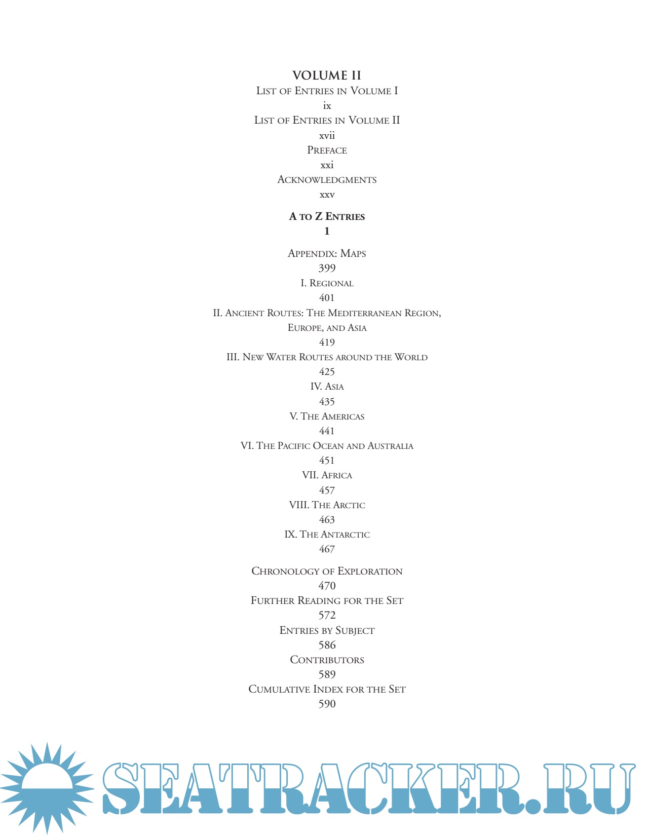 Volume 2, Places, Technologies, and Cultural Trends, has more than 260 A-Z entries on such topics as Aerial photography, Circumnavigation of the world, Drift ice, Fur trade, Native peoples and exploration, Orinoco River, Virginia Company, and Women explorers. Entries range in length from 2 paragraphs to more than 10 pages and are accompanied by 67 photographs and illustrations and 62 maps. An appendix contains maps by region; by ancient routes in the Mediterranean, Europe, and Asia; by new water routes; and by the interior in Asia, the Americas, the Pacific Ocean and Australia, Africa, the Arctic, and the Antarctic. The volume concludes with a very thorough chronology of exploration, a further reading list for the set, a list of volume 2 entries by subject, and a 35-page cumulative index for both volumes. In both volumes, capital letters are used in the text to designate terms that are also entry headings.