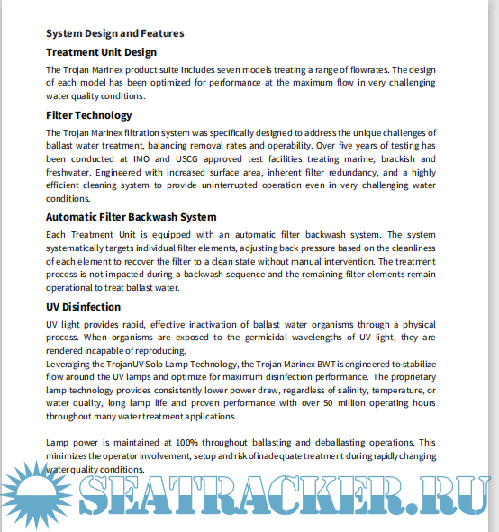 Year: 2017 Language: english Author: Trojan marinex Genre: Instruction Format: PDF Quality: eBook Number of pages: 399 Description: General Description Specifically designed for the marine environment, the Trojan Marinex BWT is unique, integrating two treatment processes, filtration and UV disinfection in one single unit. With a small footprint, lower power draw, and minimum pressure loss, the system is well suited to both newbuild and retrofit installations. With a wide operational range, the system performance is not impacted by temperature or salinity. Operation is fully-automated and can be controlled through the ship’s automation system, or through a touchscreen interface provided with the system. During ballasting operations, water is treated with filtration and UV. During deballasting operations, water is only treated with UV.The Trojan Marinex BWT consists of the following principal components; Treatment Unit • TrojanUV Solo Lamp™ Technology • Custom-designed Trojan Marinex filtration system • Automatic lamp cleaning system to ensure maximum UV output • Automatic drain and fill system to inhibit corrosion of wetted components • Junction box for all cable and control connections