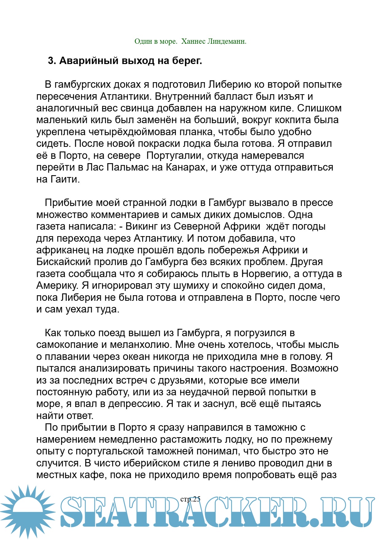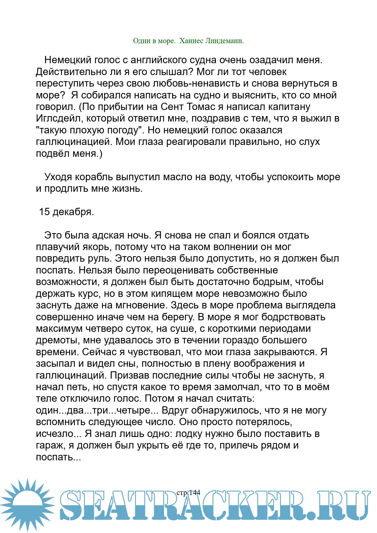 Описание: В 1956 году врач Ханнес Линдеманн пересёк Атлантический океан на каноэ за 72 дня. В путешествии он – подобно Алену Бомбару – исследовал способы выживания для потерпевших кораблекрушение. В байдарке были: 154 фунтов консервов, чеснока, пива и воды; медикаменты, камеры, дистиллятор, секстант, морские карты, морские якоря, запасные паруса, вёсла, рули, запасные части и материалы для ремонта, а также рыболовные снасти. Доктор Х. Линдеман использовал метод самовнушения, основанный на четырёх фразах: - Я этого добьюсь! - Не сдаваться! - Продолжай идти на запад! - Не принимай помощь! Он в течение многих недель плыл в океане – принципиально не принимая чьей-либо помощи – хотя экипаж встретившего его голландского судна предлагал ему это. Он только попросил голландцев уточнить координаты точки встречи в океане, чтобы проверить свои вычисления… (В аналогичной ситуации Ален Бомбар поднялся на борт встретившегося ему судна и позавтракал).