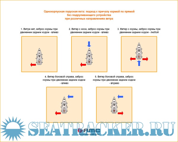 Однокорпусная парусная яхта. Подход к причалу кормой по прямой