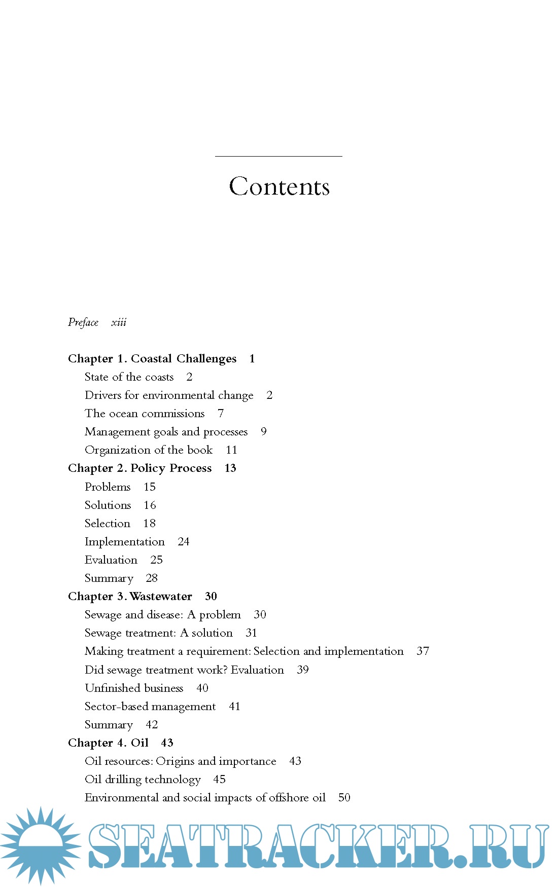 Preface xiii Chapter 1. Coastal Challenges 1 State of the coasts 2 Drivers for environmental change 2 The ocean commissions 7 Management goals and processes 9 Organization of the book 11 Chapter 2. Policy Process 13 Problems 15 Solutions 16 Selection 18 Implementation 24 Evaluation 25 Summary 28 Chapter 3. Wastewater 30 Sewage and disease: A problem 30 Sewage treatment: A solution 31 Making treatment a requirement: Selection and implementation 37 Did sewage treatment work? Evaluation 39 Unfinished business 40 Sector-based management 41 Summary 42 Chapter 4. Oil 43 Oil resources: Origins and importance 43 Oil drilling technology 45 Environmental and social impacts of offshore oil 50 Law 56 The seaweed rebellion 61 Summary 64 Chapter 5. Dredging 66 The growth of shipping 66 Dredging processes 68 Environmental impacts 70 Law of dredging and disposal 71 Regulating the disposal of contaminated sediments 78 Gridlock 79 Enduring change? 82 Summary 84 Chapter 6. Wetlands 87 The nature of coastal wetlands 87 The value of coastal wetlands 89 Uses and consequences 92 “No net loss”—a goal 95 One wetland resource—multiple agencies 96 Management practices 98 The coastal wetland program assessed 100 Summary 102 Chapter 7. Managing Coastal and Ocean Spaces 104 Uses of coastal lands and waters 105 Conflicts 107 The Coastal Zone Management Act 108 Other space-based coastal management programs 115 Spatial management techniques 116 Evaluation of state programs 119 Spatial planning and management of ocean waters 121 Summary 122 Chapter 8. Ecosystem Governance 124 Nitrogen links among land/sea and society/nature 125 Ecosystem-based management in concept 129 Degree of change 131 Policy elements 132 Incremental change: Marine sanctuaries 135 Fundamental change: Ecosystem services 138 Summary 142 Chapter 9. Watersheds and Bays 143 Evolution of river basin management 143 River/watershed management: An agency profile 148 Managing the landscape to preserve/restore bays 150 Watershed management for the Chesapeake Bay 152 Ecosystem management for watersheds and bays 157 Summary 161 Chapter 10. Fisheries 163 Expansion of U.S. fisheries 163 Biological limits to the fishery 165 Fisheries management 168 The councils 172 Fisheries management as ecosystem governance 173 Incremental change 177 Fundamental change 180 Who decides? 181 Summary 183 Chapter 11. Conclusion 185 Ends and means 186 Sector-based management 187 Spatial management 188 Ecosystem-based management 189 Change 192 Questions for Discussion 193 References 199 Further Reading 215 Glossary 219 Index 233