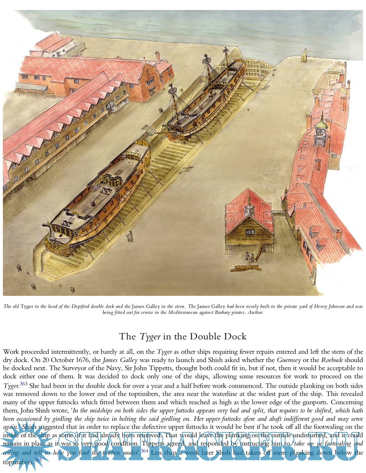 Tyger was originally built in the middle of the 17th century and served in the Anglo-Dutch Wars. It was sent to Deptford for rebuilding at the end of the wars in 1674, but the ship was left to deteriorate over the next few years and ended up as a sunken wreck at the bottom of the great double dock. Eventually, the yard officers at Deptford wrote that there was “no such thing as the Tyger” and wanted to pay off the last warrant officers belonging to her. However, King Charles II decided otherwise and kept her on the books to eventually reappear as a “rebuilt” but in fact, entirely new ship in 1681.