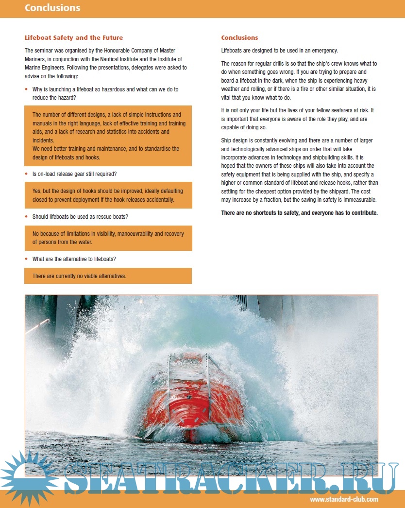 Year: 2007 Language: english Author: The Standard P&I Genre: Other Format: PDF Quality: OCR without errors Pages count: 8 Description: Lifeboats Are Meant To SAVE Lives In recent years, there have been a number of accidents during routine lifeboat drills, despite updated training and new designs of hooks, boats and davits. Part of the problem is the number of designs of hooks and lifeboats in service, estimated at more than 70, and it is essential that the crew are familiar with and capable of operating the equipment fitted on their ship.