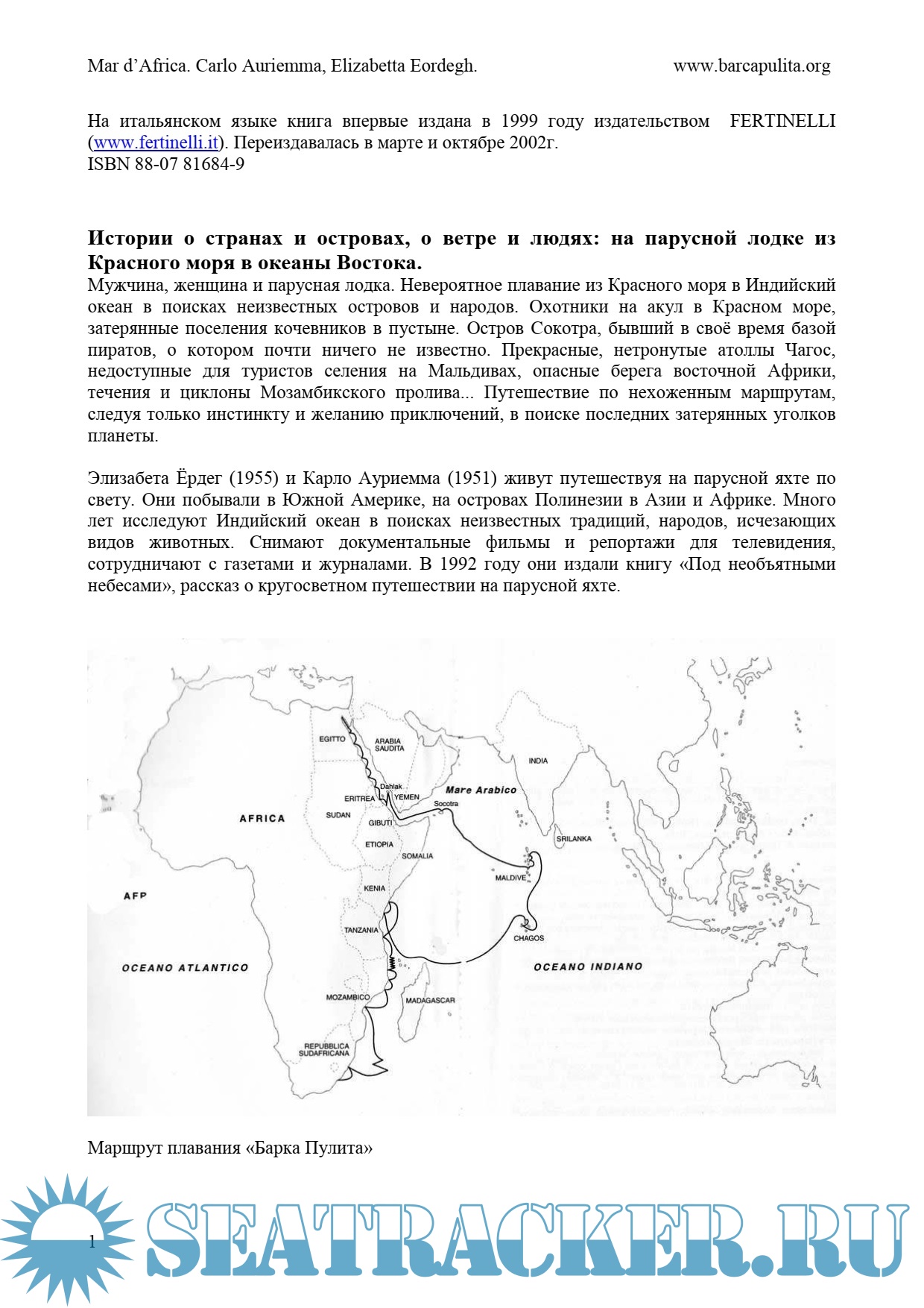 Описание: Мужчина, женщина и парусная лодка. Невероятное плавание из Красного моря в Индийский океан в поисках неизвестных островов и народов. Охотники на акул в Красном море, затерянные поселения кочевников в пустыне. Остров Сокотра, бывший в своё время базой пиратов, о котором почти ничего не известно. Прекрасные, нетронутые атоллы Чагос, недоступные для туристов селения на Мальдивах, опасные берега восточной Африки, течения и циклоны Мозамбикского пролива… Путешествие по нехоженным маршрутам, следуя только инстинкту и желанию приключений, в поиске последних затерянных уголков планеты.