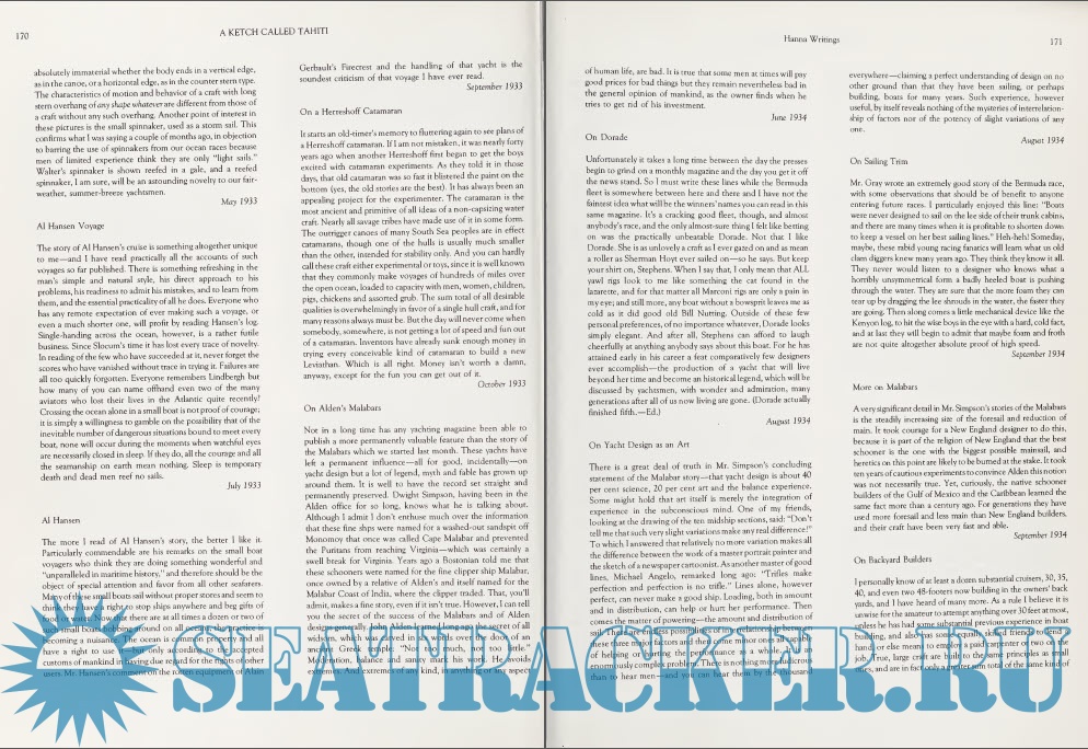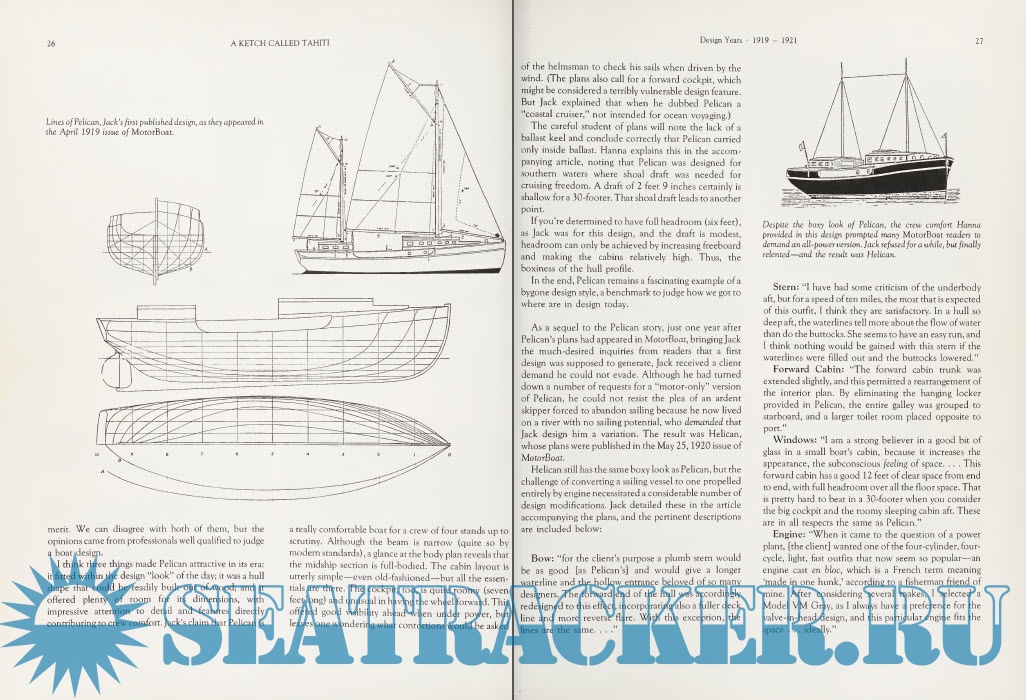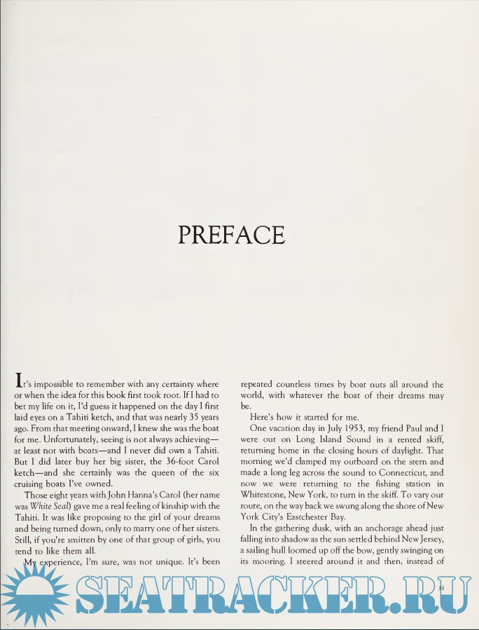 Year: 1987 Language: english Author: John Stephen Doherty Genre: Guide Publisher: Intl Marine Pub Co Edition: First ISBN: 0-87742-209-5 Format: PDF Quality: Scanned pages Pages count: 193 Description: The Tahiti ketch ... the very name has magic to it! This sturdy 30-footer rolled off the drawing board of designer John G. Hanna in the early 1920s, but made her of¬ ficial debut in 1935 among the designs in a book called How to Build 20 Boats. From that time on she seemed destined to reach out and touch responsive chords in the minds of backyard boatbuilders in every comer of the world. For about forty years (until eclipsed by the era of high-tech, fi¬ berglass cruising yachts), this would be the design that logged more ocean cruising miles than any other, bringing Hanna last¬ ing fame. Although this book gives top billing to the Tahiti ketch, its real subject is the entire career of the naval architect and nautical writer whose name for more than twenty-five years of American boating his¬ tory was synonymous with “sturdy boats, well built.’’ The first section, a biography of Hanna, is followed by a detailed presen¬ tation of more than thirty of his most im¬ portant designs, each handsomely illus¬ trated and with detailed specifications and photographs. This section also includes a sprinkling of vignettes and cruising lore from Hanna boat owners. The final section is a collection of Hanna’s own nautical writing, collected (and in a few cases, pub¬ lished) for the first time.
