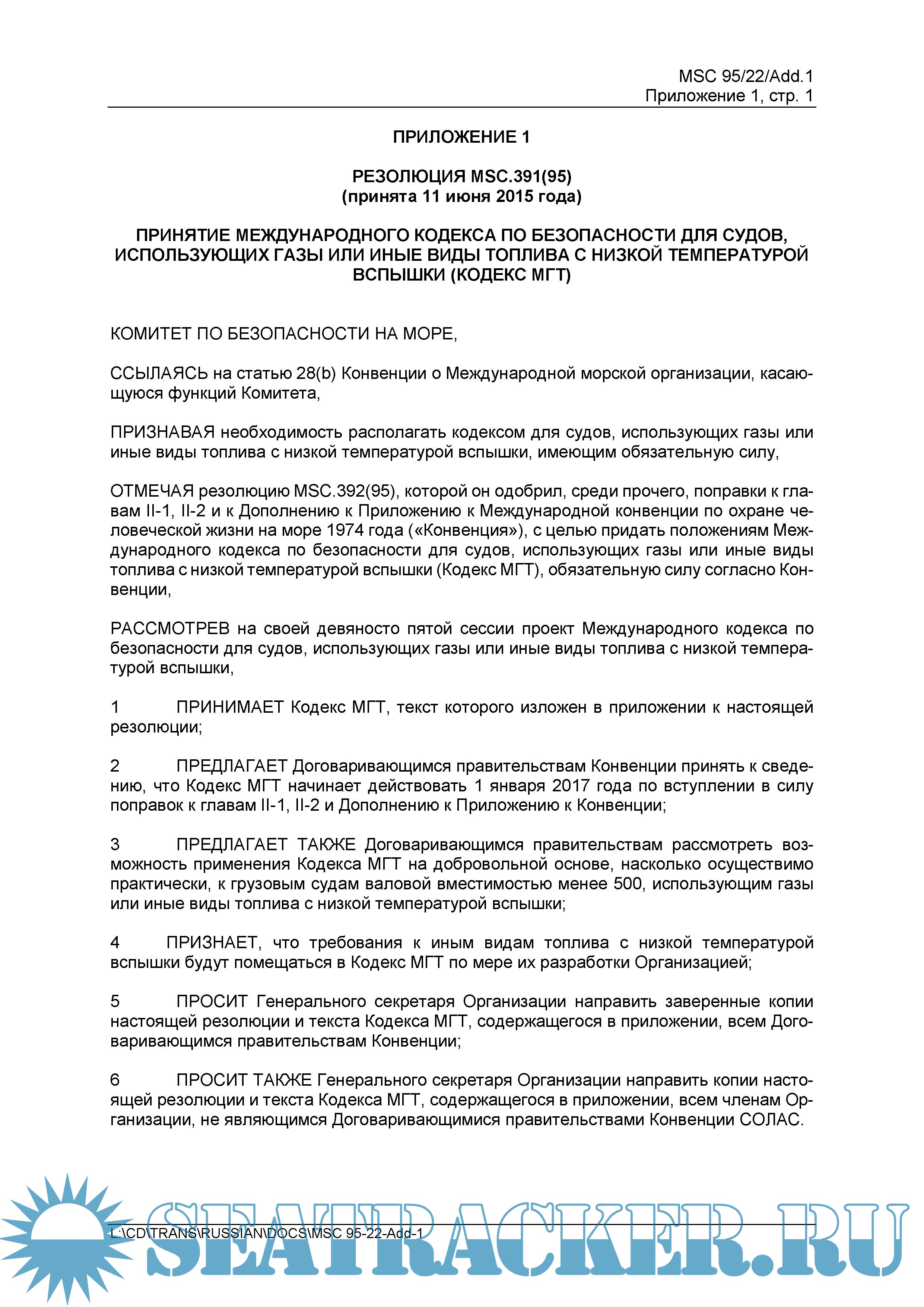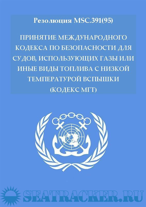 Приводится на русском языке текст резолюции MSC.391(95) Международной морской организации (ИМО) - «Принятие Международного Кодекса по безопасности для судов, использующих газы или иные виды топлива с низкой температурой вспышки (Кодекс МГТ)», принятой на 95-й сессии Комитета по безопасности на море ИМО (11 июня 2015 года)