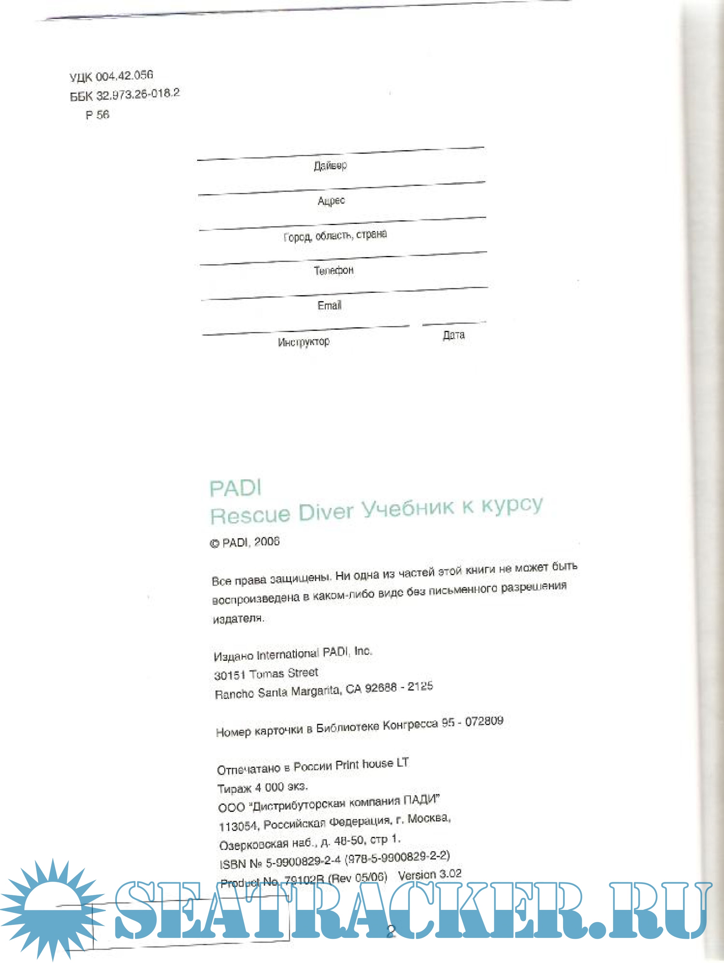 Дайвинг - это вид занятий, сопряженный с риском. Каждый дайвер в отдельности, принимающий участие в любом виде погружений, обязан согласиться с рисками и принять на себя ответственность за свои действия. Автор и издатель (и уж тем более раздающий) не несут никакой ответственности ни перед кем за утери, повреждения, травмы или смерть, вызванные любыми ошибками, пропусками в тексте, а также личной интерпретацией текста дайвером. Любая подобная ответственность не признается. Информация в данном пособии относится к дайвинrу с аквалангом и должна использоваться только как дополнение к утвержденному курсу обучения, который проводит сертифицированный инструктор.