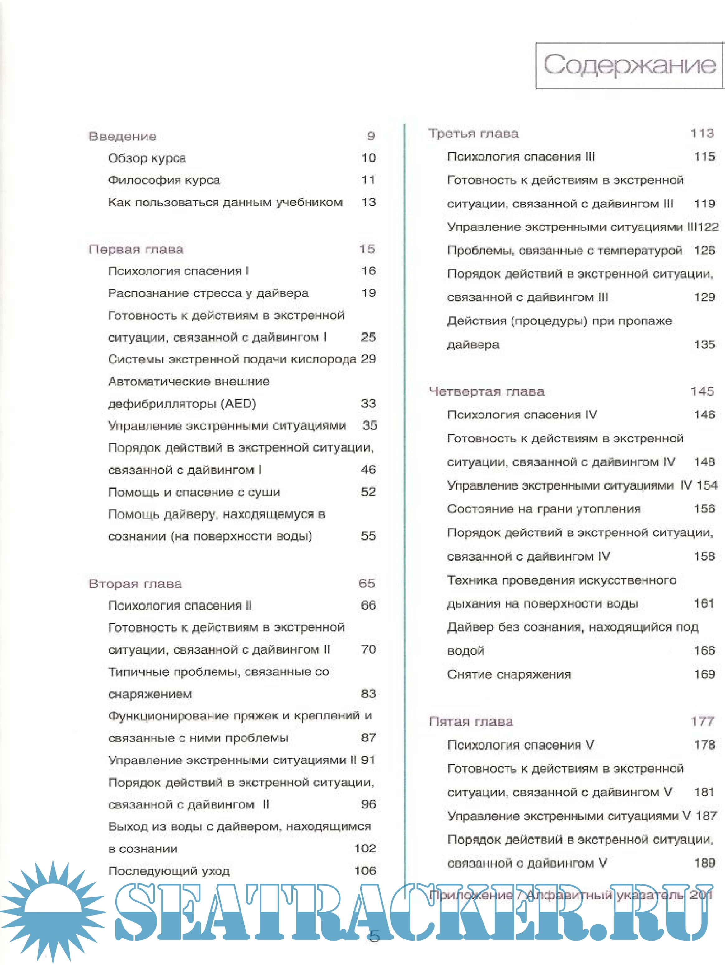 Учебные материалы для самостоятельного изучения содержат необходимую информацию о способах предотвращения экстренных ситуаций в дайвинге. Главы, посвященные вопросам безопасности спасателя, стресса у дайвера, оказания первой помощи дайверу, а также действиям в чрезвычайной ситуации, проблемам со снаряжением, и другим темам, готовят вас к тому, чтобы вы умели справиться пракически с любой экстренной ситуацией, на берегу или в воде.