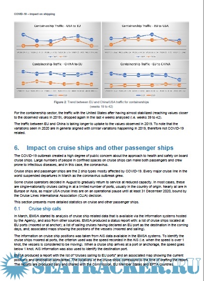 Year: 2020 Language: english Author: European Maritime Safety Agency Genre: Research papers Publisher: European Maritime Safety Agency Format: PDF Quality: eBook Pages count: 20 Description: The recent and on-going global outbreak of the Coronavirus (COVID-19) has had a major impact on global shipping, affecting all shipping sectors from passenger ships to container ships and oil tankers. The coronavirus crisis escalated to unprecedented levels in Europe in March, with a severe impact on health, people and economy. Many countries have responded to the pandemic by imposing lockdowns or restricting movement. Since the start of the COVID19 crisis, the Commission, the Member States and the shipping industry have been taking measures to ensure the continuity of operations and thus the security of supply. Coronavirus is an ongoing situation that is evolving day by day and the effects could be deep and long-term. What shipping will look like post COVID-19 is unclear; however, EMSA has the necessary data and tools to analyse the impact of the pandemic on certain shipping activities by analysing vessel traffic data and providing reliable figures to assist in the definition of the recovery policies and specific measures. These figures should assist all parties involved (EU, maritime administrations and shipping industry) in determining a recovery strategy to overcome the economic crisis that Europe is facing. The objective of this report is to provide figures on the impact of COVID-19 on shipping traffic; it is based on solid vessel movements statistics showing the port call trends without interpreting the statistical data. The report could not serve the purpose of an economic impact analysis since the trade volumes are not available in the EMSA systems. The report focuses mainly on EU ports and EU flagged ships, but there are also statistics about the shipping routes from Europe to China and from Europe to the US have been affected.